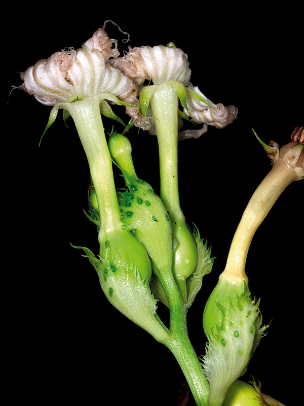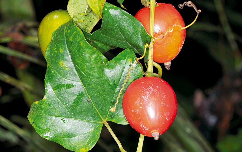 ไม้เถา ยาวได้ถึง 20 ม. มือจับแยก 2–3 แขนง ใบประดับที่โคนช่อดอกรูปไข่กลับ ยาวประมาณ 1 ซม. ใบรูปไข่กว้าง ยาว 7–15 ซม. จัก 3–5 พู แผ่นใบสากด้านบน ก้านใบยาว 3–7.5 ซม. ช่อดอกเพศผู้ยาว 7–16 ซม. ใบประดับรูปไข่กลับ ยาว 1.5–4 ซม. ชายครุยมีต่อมกระจาย ดอกเพศผู้ก้านดอกยาว 3–5 มม. ฐานดอกยาว 3–5 ซม. กลีบเลี้ยงรูปสามเหลี่ยม ยาว 1–1.5 ซม เรียบ หรือจักตื้น ๆ ดอกสีขาว ยาวประมาณ 1.5 ซม. ชายครุยยาวได้ถึง 2 ซม. ดอกเพศเมียก้านดอกยาว 0.5–1 ซม. ผลรูปไข่กว้าง ยาว 6–7 ซม. เนื้อด้านในสีดำอมเขียว