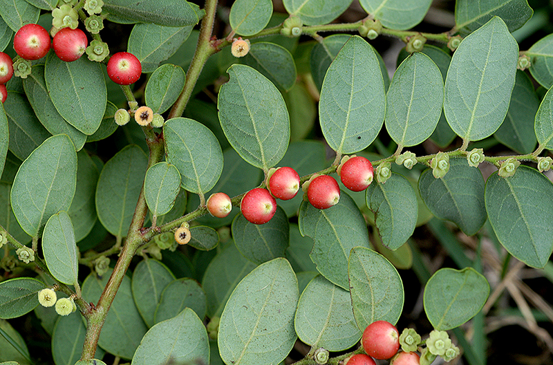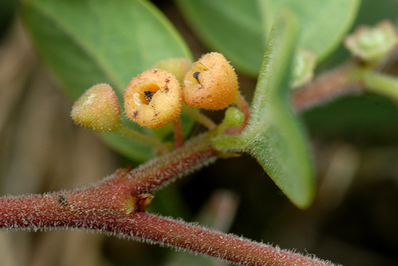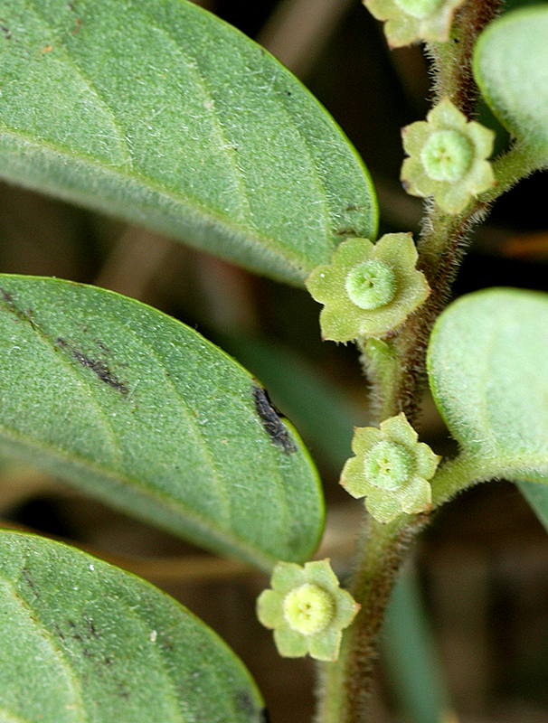 ไม้พุ่มหรือรอเลื้อย สูงได้ถึง 5 ม. กิ่งและใบมีขนหนาแน่น ใบเรียงสลับระนาบเดียว รูปรีหรือรูปไข่ ยาว 1.3–5 ซม. ด้านล่างมีนวล ก้านใบยาว 1–3 มม. ดอกเพศผู้อยู่ช่วงโคนกิ่ง ก้านดอกยาว 0.5–3 มม. กลีบเลี้ยงสีชมพูอมน้ำตาล ยาวประมาณ 1.7 มม. จักตื้น ๆ เกสรเพศผู้เชื่อมติดกันประมาณ 1 มม. ดอกเพศเมียก้านดอกยาว 0.5–1.5 มม. กลีบเลี้ยงยาว 1.5–2 มม. ขยายในผล ด้านนอกมีขน รังไข่มีขน ผลกลม เส้นผ่านศูนย์กลางประมาณ 5 มม. ปลายมีกะบัง สุกสีแดง เมล็ดยาวประมาณ 4 มม. เยื่อหุ้มสีส้ม (ดูข้อมูลเพิ่มเติมที่ ครามน้ำ, สกุล)