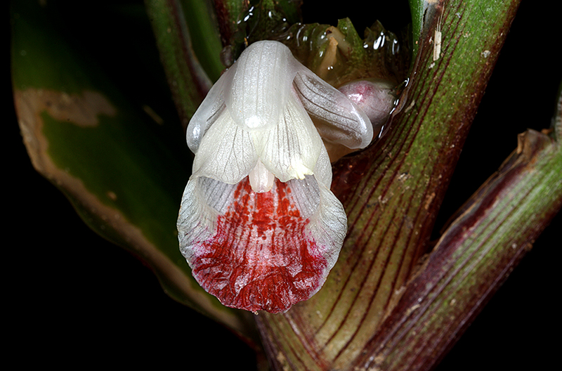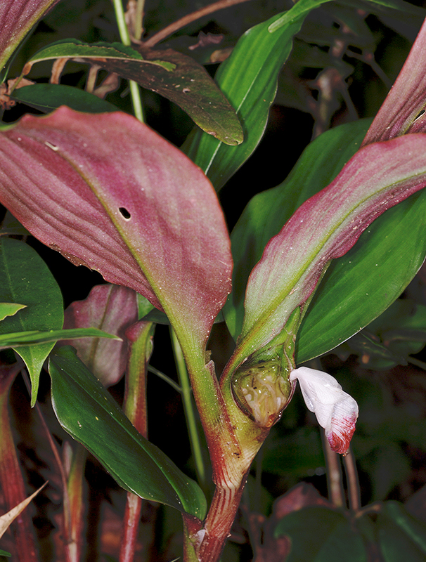 ไม้ล้มลุก สูง 5–10 ซม. ไม่มีรากสะสมอาหาร กาบใบยาว 3–4 ซม. ลิ้นกาบยาว 1–2 มม. ใบรูปใบหอก ยาว 10–18 ซม. แผ่นใบด้านล่างสีแดงม่วง มีขนสั้นนุ่ม ซอกใบและใบประดับมีเมือกใส ช่อดอกสั้น ใบประดับ 6–7 ใบ ยาว 1.2–2 ซม. แกนช่อยาวประมาณ 1 ซม. ใบประดับย่อยยาว 0.5–1 ซม. หลอดกลีบเลี้ยงยาว 4–5 มม. หลอดกลีบดอกยาวประมาณ 2 ซม. กลีบดอกรูปไข่กลับ ยาวประมาณ 1 ซม. แผ่นเกสรเพศผู้ด้านข้างที่เป็นหมันรูปรีแคบ ยาว 1.2–1.4 ซม. กลีบปากห่อเป็นถุง ยาวประมาณ 2.5 ซม. สีขาว มีปื้นและจุดสีแดงกระจาย เกสรเพศผู้ยาวประมาณ 1 ซม. อับเรณูมีขนด้านหลัง ไม่มีสันอับเรณู (ดูข้อมูลเพิ่มเติมที่ กระชาย, สกุล)