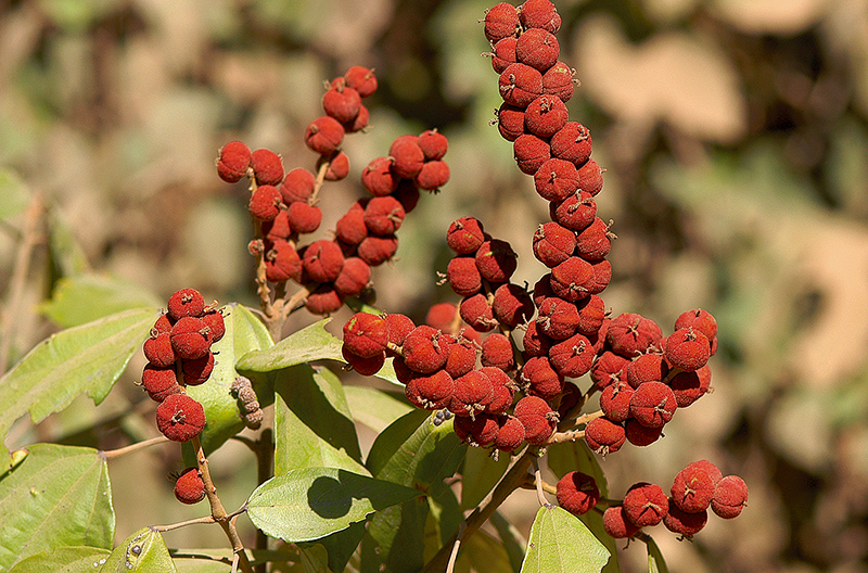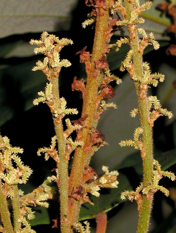 คำแสด: ช่อดอกแบบช่อกระจะหลายช่อตามปลายกิ่ง ดอกเพศผู้สีเขียว ดอกเพศเมียสีเหลืองหรือแดง ยอดเกสรเพศเมียติดทน (ภาพ: ราชันย์ ภู่มา, วรดลต์ แจ่มจำรูญ, ปรีชา การะเกตุ)