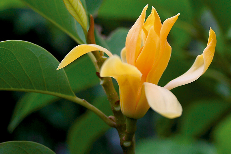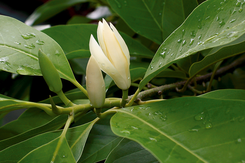 จำปีป่า: หูใบแนบติดก้านใบน้อยกว่ากึ่งหนึ่ง กลีบรวม 15–21 กลีบ เรียงหลายวง รูปใบหอกแคบ กลีบวงในสั้นกว่าวงนอก (ภาพ: สุคนธ์ทิพย์ ศิริมงคล)