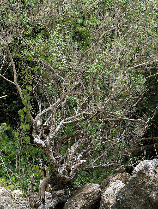 เทียนเล: ลำต้นมักบิดงอจากแรงลมและคลื่น ใบอวบน้ำ ดอกออกเดี่ยว ๆ หรือเป็นคู่ตามซอกใบ มี 6 กลีบ ผลแห้งแตกมีฝาเปิดด้านบน เกสรเพศเมียติดทน (ภาพ: ราชันย์ ภู่มา)