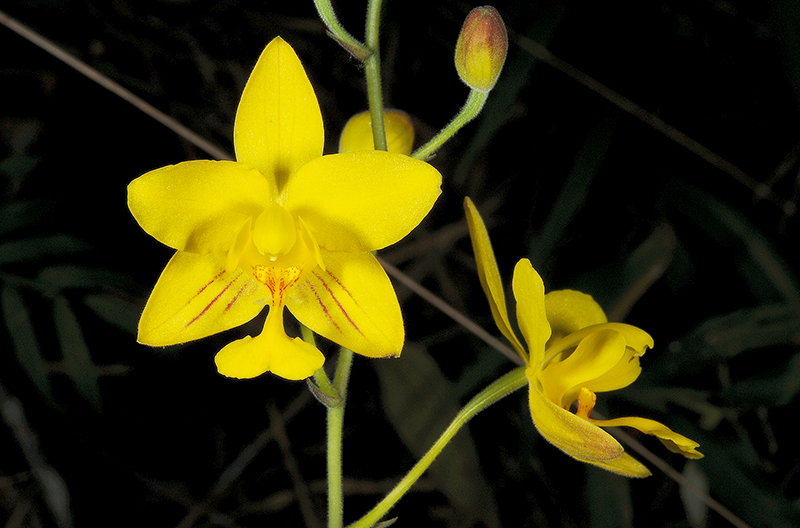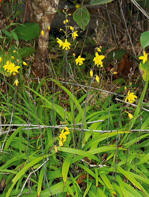 กล้วยไม้ดิน ลำลูกกล้วยรูปไข่ แบน เส้นผ่านศูนย์กลางประมาณ 3 ซม. ใบพับจีบ มี 2–4 ใบ รูปใบหอกหรือรูปแถบ ยาว 10–42 ซม. โคนสอบเรียว ช่อดอกแบบช่อกระจะ ออกที่โคนลำลูกกล้วย ช่อตั้งขึ้น มีขนสั้นนุ่ม ก้านช่อยาว 15–60 ซม. แกนช่อยาว 5–20 ซม. มีได้ถึง 15 ดอก ใบประดับ 4–8 ใบ รูปใบหอก ยาว 0.5–3 ซม. ใบประดับที่มีดอกรูปไข่แกมรูปใบหอก ยาว 0.3–1 ซม. ดอกสีเหลือง กลีบเลี้ยงคู่ล่างและปุ่มนูน โคนกลีบปาก (cali) มักมีปื้นสีแดง กลีบเลี้ยงรูปรี ยาว 1.5–2 ซม. ปลายแหลม กลีบดอกคล้ายกลีบเลี้ยง ขนาดเท่า ๆ กัน ปลายมน กลีบปากมี 3 พู พูกลางยาว 1–1.8 ซม. โคนเรียวเป็นก้านยาวเท่า ๆ แผ่นกลีบรูปพัด พูข้างรูปรี ยาว 0.5–1 ซม. โคนกลีบปากมีปุ่มนูนรูปกระบอง 2 ปุ่ม โคนเชื่อมติดกัน มีขนยาว เส้าเกสรเรียว ยาว 1–1.4 ซม. กลุ่มเรณู 8 กลุ่ม แยกเป็น 2 กลุ่มย่อย ก้านและรังไข่ยาว 1.4–3.3 ซม. ฝักแห้งแตก รูปรี ยาว 1.8–3 ซม.