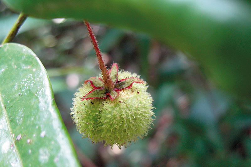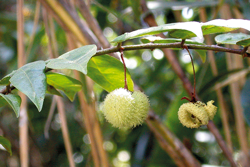 มะยมฉัตร: มีขุยสีน้ำตาลแดงตามกิ่ง ขอบกลีบเลี้ยงจักชายครุย ก้านผลยาว ผลมีขนยาวหนาแน่น (ภาพ: มานพ ผู้พัฒน์, สุคนธ์ทิพย์ ศิริมงคล)