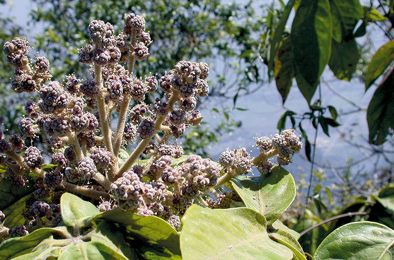 ไม้พุ่มอิงอาศัย สูงได้ถึง 5 ม. มีขนสั้นนุ่มหนาแน่นตามกิ่งอ่อน หูใบ ก้านใบ แผ่นใบอ่อนด้านล่าง ช่อดอก ใบประดับ และดอก หูใบรูปสามเหลี่ยม ยาว 1.5–2 ซม. ใบย่อยมี 5–6 ใบ ก้านใบยาว 10–23 ซม. ใบรูปไข่กลับหรือแกมรูปขอบขนาน ยาว 12–26 ซม. ปลายแหลมยาว โคนกลม ขอบจักซี่ฟันช่วงปลาย ก้านใบย่อยยาว 1.5–7 ซม. ก้านช่อดอกยาว 3–6 ซม. ใบประดับขนาดเล็กจำนวนมาก ช่อแยกแขนงยาว 6–19 ซม. มีช่อซี่ร่ม 7–18 ช่อ ก้านช่อยาว 0.5–2 ซม. มี 10–25 ดอก ติดเป็นผล 4–6 ผล ก้านดอกยาว 1–3 มม. กลีบดอก 5 กลีบ รูปสามเหลี่ยมมน ยาวประมาณ 1.5 มม. ยอดเกสรเพศผู้ 5 อัน ไร้ก้าน ติดทน ผลรูปรี ยาว 7–8 มม. สุกสีส้มเปลี่ยนเป็นสีม่วงอมเทา