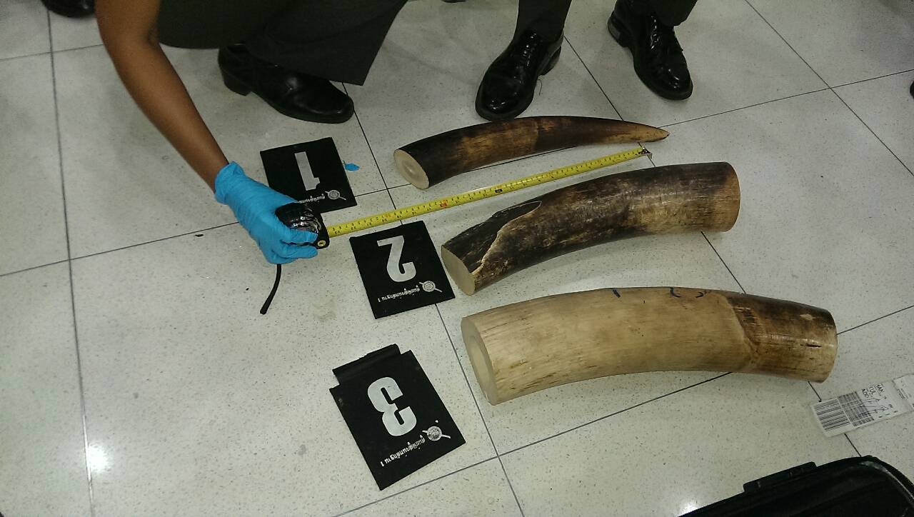 วันที่ 16 ธันวาคม 2558 ด่านตรวจสัตว์ป่าสุวรรณภูมิร่วมกับ บกปทส. ศุลกากร ร่วมตรวจยึดกระเป๋าบรรจุงาช้าง จำนวน 3 ท่อน น้ำหนักรวม 21กก. มาจากเอธิโอเปีย ต่อกัวลาลัมเปอร์ ปลายทางฮานอ