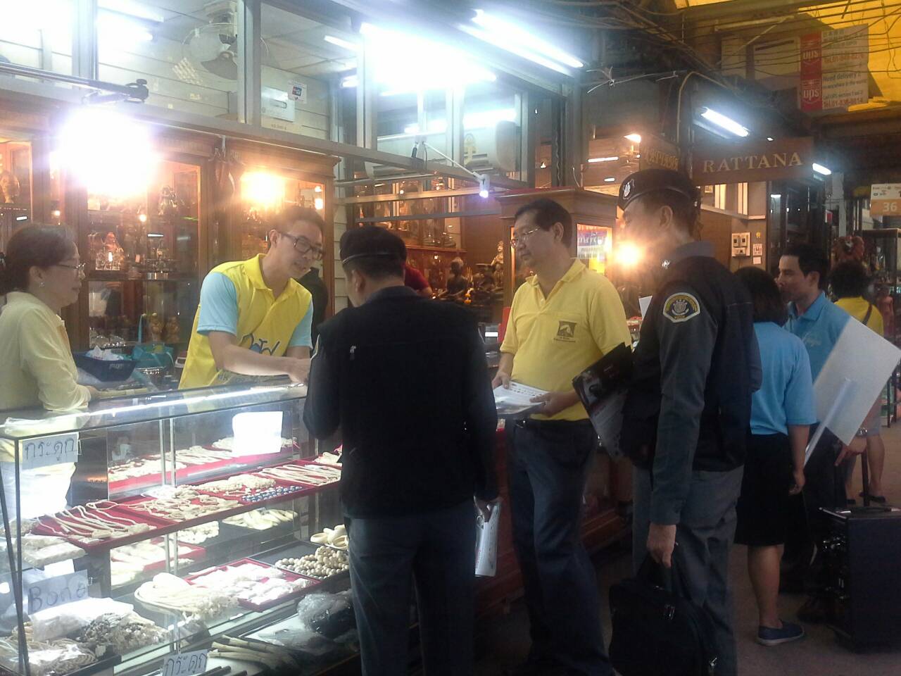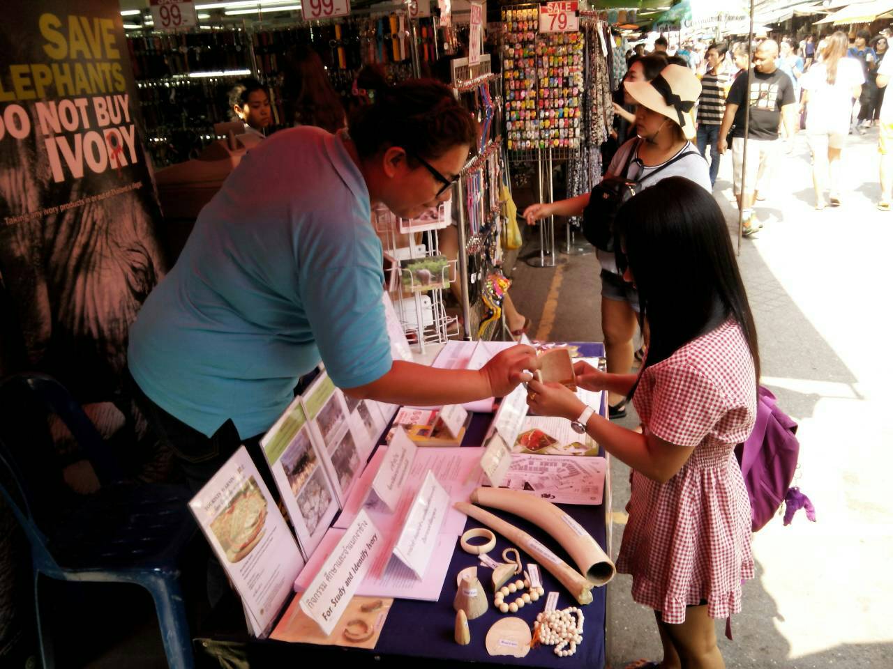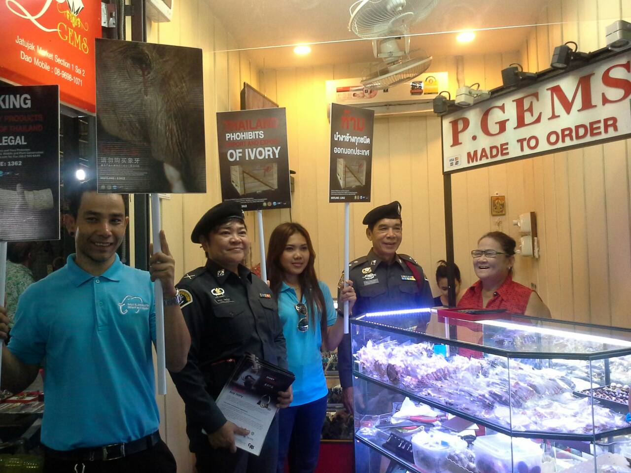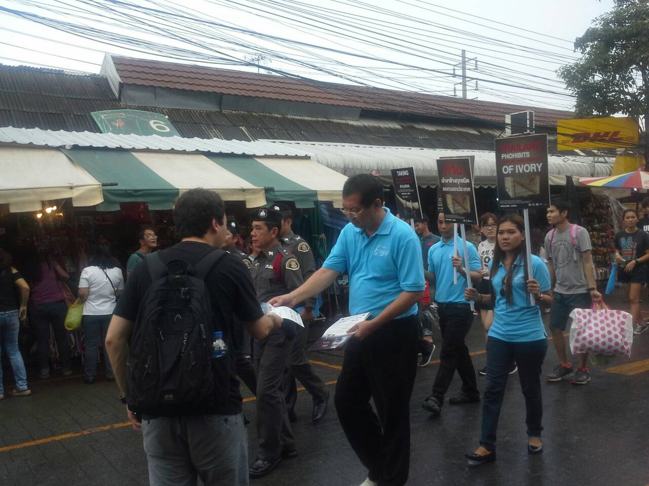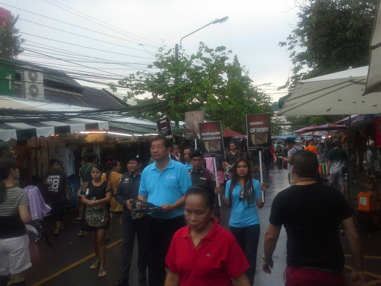 เจ้าหน้าที่กรมอุทยานแห่ชาติ สัตว์ป่าและพันธุ์พืช ร่วมกับเจ้าหน้าที่ตำรวจ บก.ปทส. รณรงค์ประชาสัมพันธ์ ไม่ให้นักท่องเที่ยวชาวต่างชาติซื้องาช้างจากประเทศไทย และร่วมตรวจร้านค้างาช้าง ที่ตลาดนัดจตุจักร กทม. ทุกอาทิตย์ |