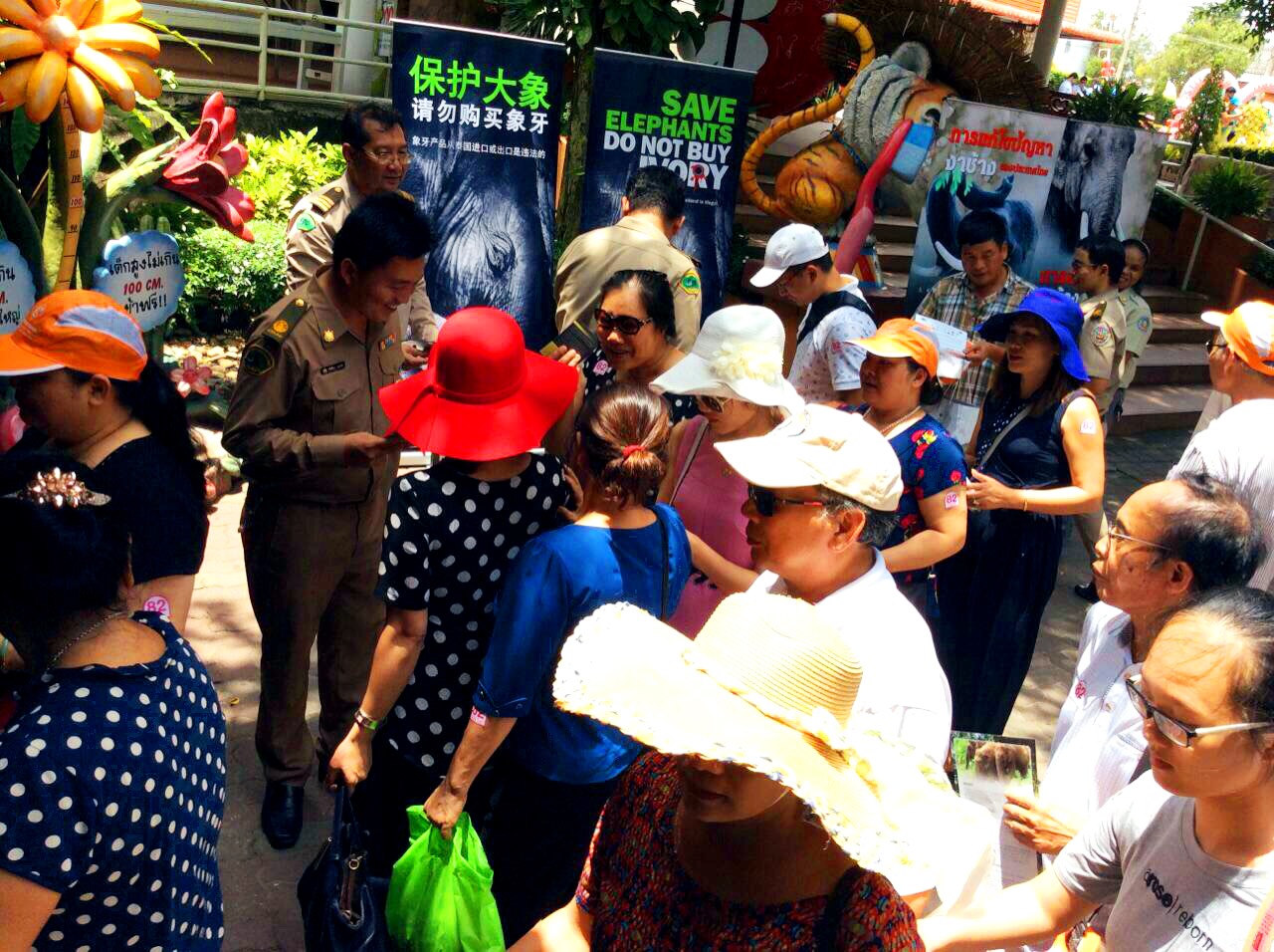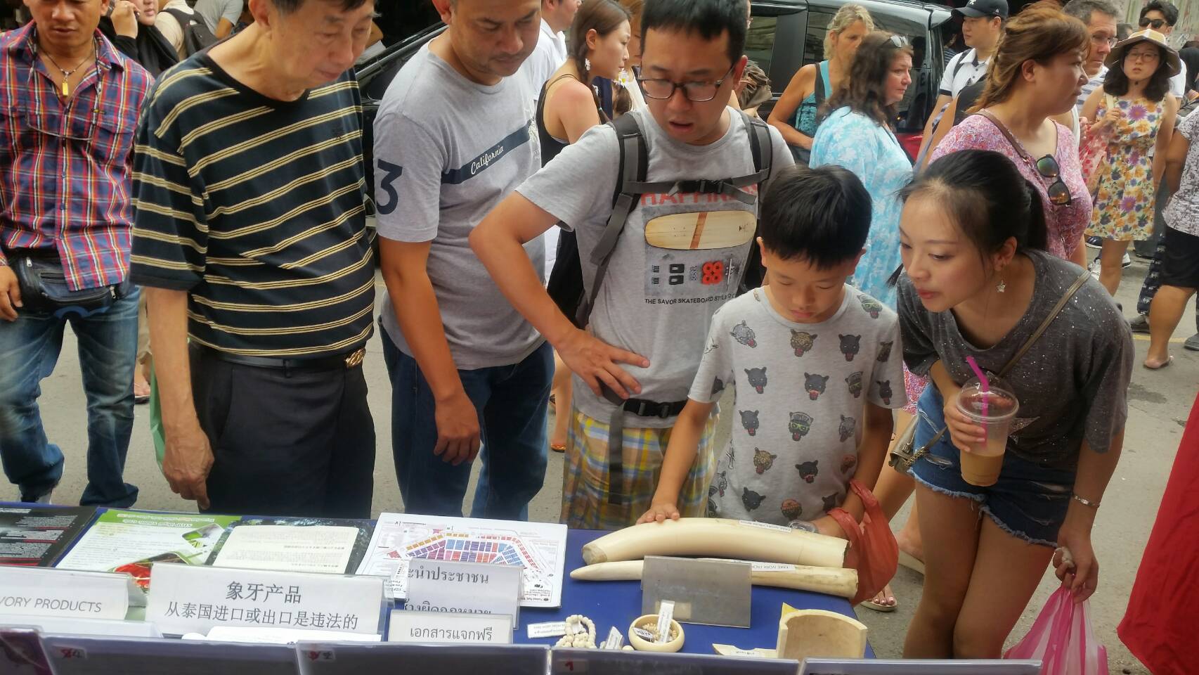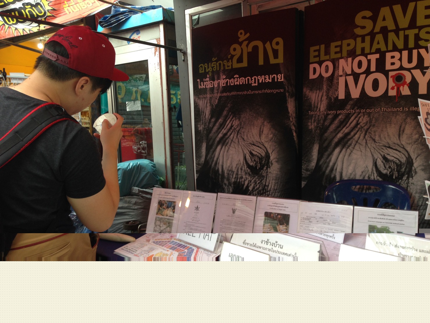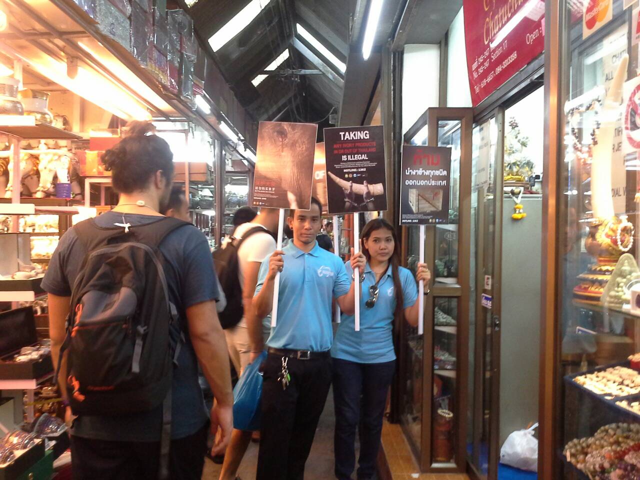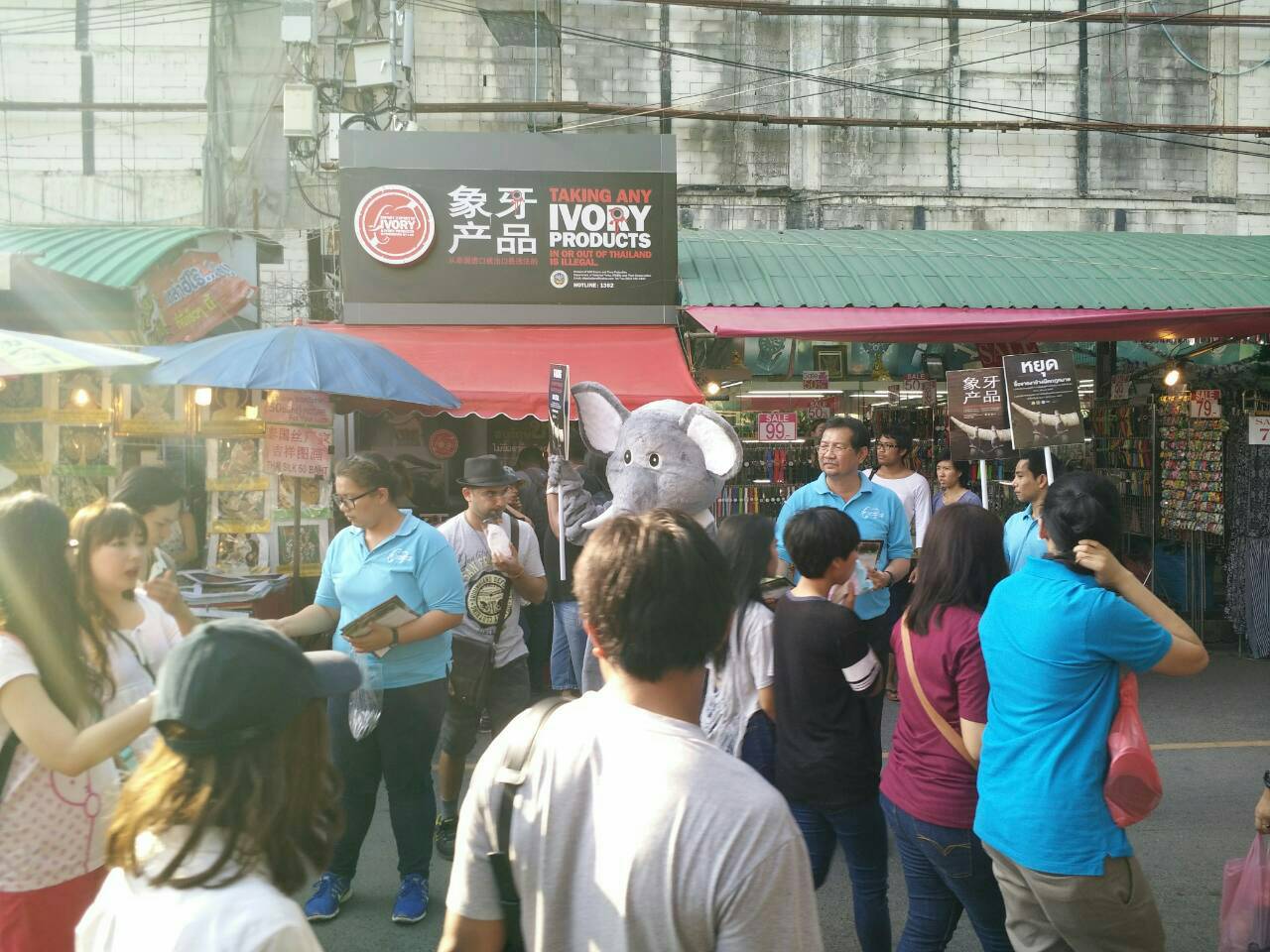 เจ้าหน้าที่กรมอุทยานแห่ชาติ สัตว์ป่าและพันธุ์พืช ร่วมกับเจ้าหน้าที่ตำรวจ บก.ปทส. รณรงค์ประชาสัมพันธ์ ไม่ให้นักท่องเที่ยวชาวต่างชาติซื้องาช้างจากประเทศไทย และร่วมตรวจร้านค้างาช้าง ที่ตลาดนัดจตุจักร กทม. ทุกอาทิตย์ |