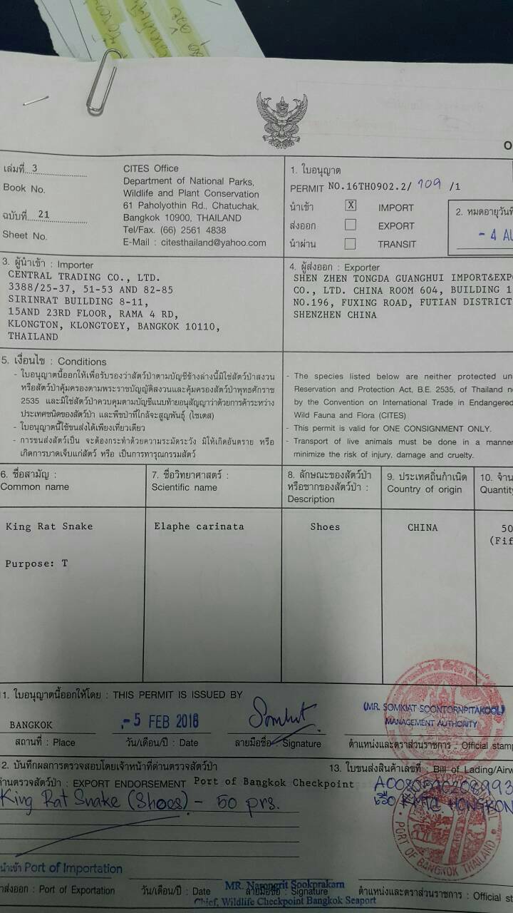 วันที่ 9 กุมภาพันธ์ 2559 ด่านตรวจสัตว์ป่าท่าเรือกรุงเทพ ส่งรายงานการตรวจสินค้า รองเท้าหนังงู king rat snake นำเข้าครับ |