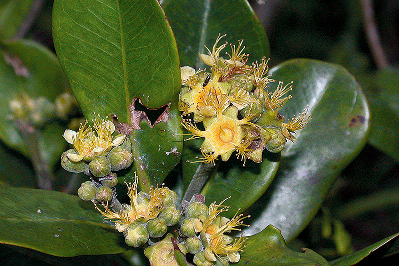 ไม้พุ่มหรือไม้ต้น สูงได้ถึง 15 ม. เปลือกลอกเป็นแผ่น หูใบขนาดเล็ก ร่วงเร็ว ใบรูปไข่ หรือรูปไข่กลับ ยาว 3–10 ซม. แผ่นใบหนา ด้านล่างมีต่อมกระจาย เส้นแขนงใบจำนวนมากเรียงจรดกันเป็นเส้นขอบใน ก้านใบยาว 2–3 มม. มีขนละเอียด ช่อดอกยาวได้ถึง 10 ซม. ใบประดับรูปใบหอก ยาวประมาณ 4 มม. ก้านดอกยาวได้ถึง 2.5 มม. ก้านดอกเทียมยาวประมาณ 1 มม. ฐานดอกรูปกรวย กลีบเลี้ยงขนาดเล็ก ดอกสีขาวหรืออมเหลือง เส้นผ่านศูนย์กลางประมาณ 2 มม. เกสรเพศผู้เชื่อมติดกัน 5 มัด มัดละ 5–15 อัน ติดตรงข้ามกลีบดอก ก้านชูอับเรณูยาว 1–2.5 มม. โคนมีขน รังไข่มีขนสั้นนุ่มช่วงปลาย ก้านเกสรเพศเมียยาวประมาณ 2 มม. ผลรูปรีกว้าง ยาว 1–1.2 ซม. (ดูข้อมูลเพิ่มเติมที่ ก้าว, สกุล)