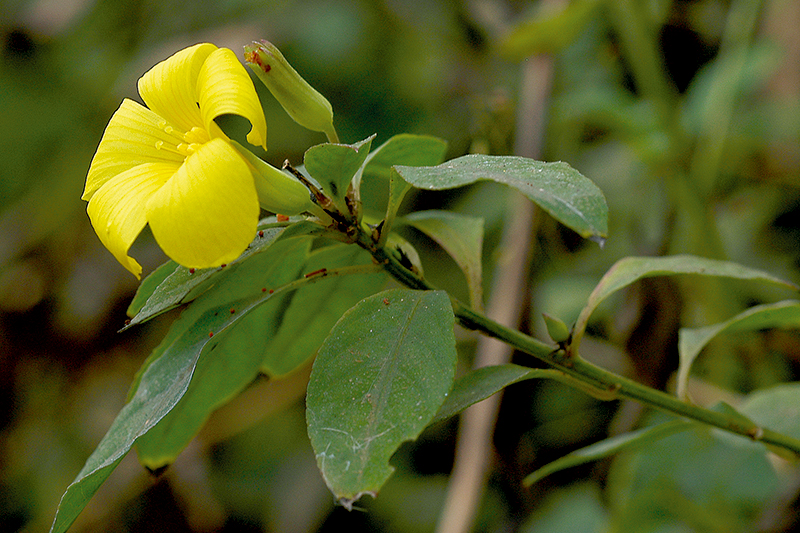 ไม้พุ่ม สูงได้ถึง 1 ม. หูใบขนาดเล็ก ร่วงเร็ว ใบเรียงเวียน รูปไข่กลับ รูปรี หรือรูปใบหอก ยาว 1–9 ซม. ปลายแหลมหรือมน มักมีติ่งแหลม ขอบเรียบ ก้านใบยาว 0.5–2.5 ซม. ดอกออกเดี่ยว ๆ หรือเป็นช่อกระจุกสั้น ๆ ตามซอกใบ กลีบเลี้ยง 5 กลีบ รูปใบหอกแคบ ยาว 1–1.5 ซม. ติดทน ดอกสีเหลือง เส้นกลีบช่วงโคนสีแดง มี 4–5 กลีบ รูปไข่กลับ ยาว 1.5–3 ซม. เกสรเพศผู้ 5 อัน ติดใต้รังไข่ โคนเชื่อมติดกัน มี 2–5 ต่อม ก้านชูอับเรณูยาวประมาณ 1.3 ซม. เกสรเพศผู้ที่เป็นหมัน 5 อัน รูปลิ่มแคบ รังไข่เกลี้ยง มี 3–4 ช่อง แต่ละช่องมี 2 ช่องย่อย มีออวุลเม็ดเดียว เกสรเพศเมีย 3–4 อัน ยาว 0.7–1.8 ซม. ผลแห้งแตก รูปรีกว้างเกือบกลม แตกเป็น 6–8 ส่วน เมล็ดรูปคล้ายไต มีปีกบาง