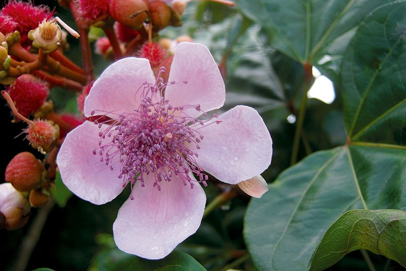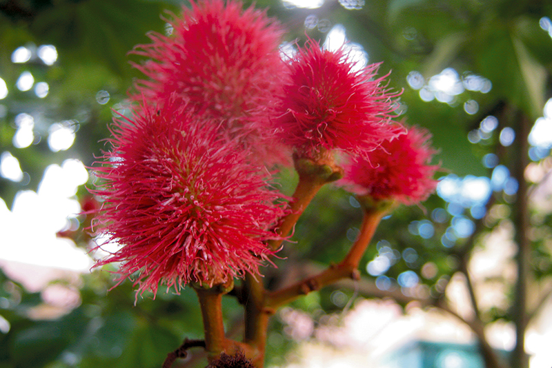 คำเงาะ: ช่อดอกแบบช่อแยกแขนงออกที่ปลายกิ่ง บานทีละ 1–2 ดอก กลีบดอกขนาดไม่เท่ากัน เกสรเพศผู้จำนวนมาก ผลแห้งแตกมีขนแข็งสีแดงหนาแน่น (ภาพ: สุคนธ์ทิพย์ ศิริมงคล)