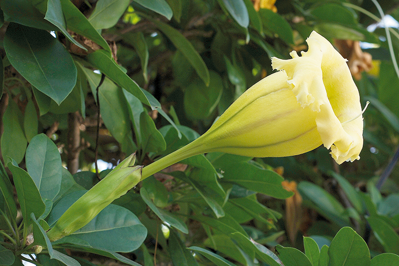 ไม้พุ่มรอเลื้อยหรืออิงอาศัย ใบเรียงเวียน รูปรีหรือรูปไข่กลับ ยาวได้ถึง 15 ซม. ก้านใบยาว 1–5 ซม. ดอกออกเดี่ยว ๆ ตามปลายกิ่ง สีเขียวอมเหลือง ด้านในมีปื้นสีม่วงน้ำตาล หลอดกลีบเลี้ยงสั้นกว่าหลอดกลีบดอก ยาว 5–8 ซม. ปลายแยก 2–5 แฉกตื้น ๆ ไม่สมมาตร ดอกรูปถ้วยสอบ ยาว 16–24 ซม. ปลายแยกเป็น 5 กลีบตื้น ๆ เรียงซ้อนเหลื่อม ขอบจักชายครุย เกสรเพศผู้ 5 อัน ติดเหนือโคนหลอดกลีบ 8–10 ซม. จุดติดบนหลอดกลีบมีขน ไม่ยื่นพ้นปากหลอดกลีบดอก อับเรณูติดที่ฐาน รูปขอบขนาน ยาว 0.9–1.3 ซม. มี 2 คาร์เพล แต่ละคาร์เพลมี 4 ช่อง บางส่วนอยู่ใต้วงกลีบ มีต่อมน้ำต้อย ก้านเกสรเพศเมียเรียวยาว ยอดเกสรแยกเป็น 2 พู ผลสดมีหลายเมล็ด รูปกรวยกว้าง ยาว 4–5 ซม. ผนังเหนียว