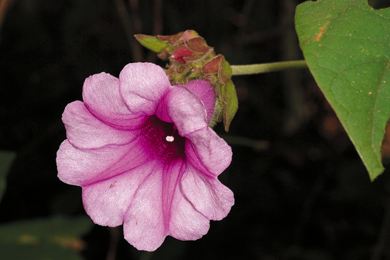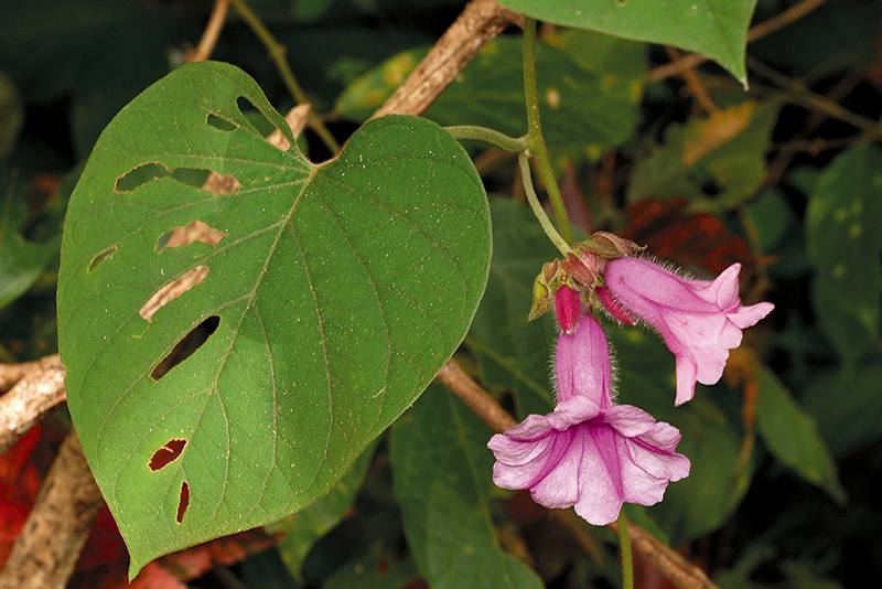 ไม้เถาล้มลุก มีขนยาวตามกิ่ง แผ่นใบด้านล่าง ก้านใบ ใบประดับ กลีบเลี้ยงและกลีบดอกด้านนอก ใบรูปไข่กว้างหรือเกือบกลม ยาว 7–17 ซม. ก้านใบยาว 5–16 ซม. ช่อดอกแบบช่อกระจุก ก้านช่อยาว 3–8 ซม. ใบประดับรูปสามเหลี่ยมแคบคล้ายลิ้น ยาว 2–2.4 ซม. ติดทน มีก้านสั้น ๆ ก้านดอกสั้น กลีบเลี้ยง 3 กลีบนอก รูปใบหอก ยาวประมาณ 9 มม. ปลายแหลม กลีบคู่ในรูปไข่กลับ ยาวประมาณ 6 มม. ปลายมน ดอกรูปแตร สีชมพูอมม่วง แถบและปากหลอดด้านในสีเข้ม ยาว 3.5–4 ซม. เกสรเพศผู้ยาวประมาณ 1.7 ซม. โคนมีต่อมขน จานฐานดอกรูปวงแหวน รังไข่เกลี้ยง ก้านเกสรเพศเมียยาวประมาณ 2.4 ซม. ผลเส้นผ่านศูนย์กลางประมาณ 1 ซม. มีกลีบเลี้ยงที่ขยายหุ้ม (ดูข้อมูลเพิ่มเติมที่ เครือพุงหมู, สกุล)