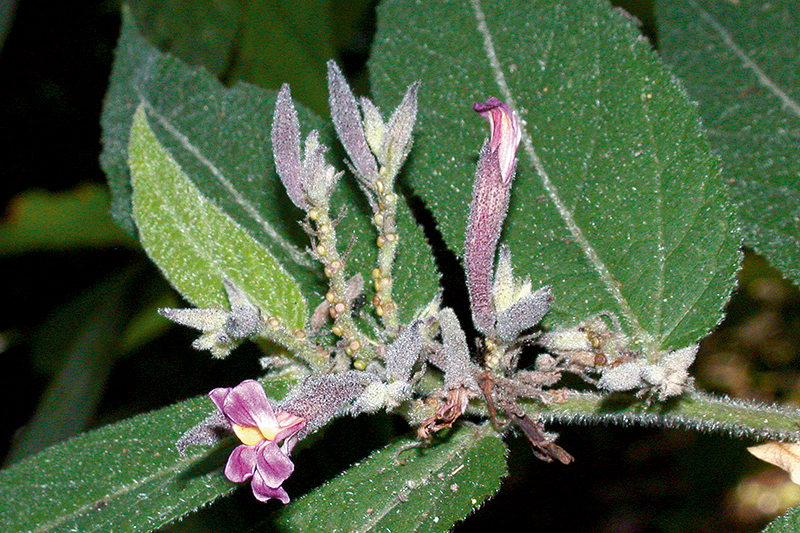 ปอเต่าไห้: ช่อดอกแบบช่อกระจุกคล้ายช่อเชิงลด ดอกสีม่วงอมแดง ผลรูปขอบขนาน ปลายเป็นจะงอยแหลมยาว มีขนยาวและตุ่มหนาแน่น กลีบเลี้ยงติดทน (ภาพ: ราชันย์ ภู่มา)
