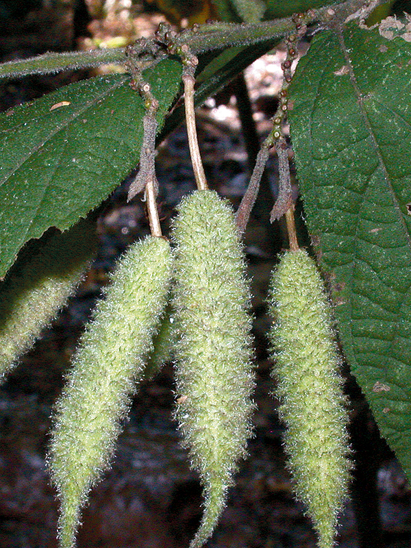 ไม้พุ่ม สูง 1–5 ม. มีขนรูปดาวหนาแน่นตามกิ่ง และแผ่นใบทั้งสองด้าน ใบรูปรี รูปไข่ หรือรูปขอบขนาน ยาว 5–20 ซม. โคนเบี้ยว ขอบใบจักฟันเลื่อย เส้นโคนใบข้างละ 1–2 เส้น ก้านใบยาว 0.5–2.5 ซม. มีขนสั้นนุ่มหนาแน่น ช่อดอกแบบช่อกระจุกคล้ายช่อเชิงลด ออกตามซอกใบ ยาวได้ถึง 3 ซม. ก้านดอกมีข้อ กลีบเลี้ยงยาว 1–1.5 ซม. ด้านนอกมีขนละเอียด ดอกสีม่วงอมแดง กลีบรูปใบหอก ยาว 2–2.5 ซม. รังไข่เป็นสัน มีขนเป็นตุ่ม ก้านเกสรเพศเมียยาวเท่า ๆ รังไข่ ยอดเกสรจัก 5 พู ผลรูปขอบขนาน ยาว 3.5–4 ซม. มี 5 สัน ปลายเป็นจะงอย มีขนยาวและตุ่มหนาแน่น เมล็ดขนาดเล็กจำนวนมาก (ดูข้อมูลเพิ่มเติมที่ ขี้อ้น, สกุล)พบที่อินเดีย จีนตอนใต้ พม่า ภูมิภาคอินโดจีนและมาเลเซีย ถึงฟิลิปปินส์ ในไทยพบทุกภาค ขึ้นตามป่าเบญจพรรณ ป่าเต็งรัง ป่าดิบแล้ง และป่าดิบชื้น ความสูงถึงประมาณ 1000 เมตร