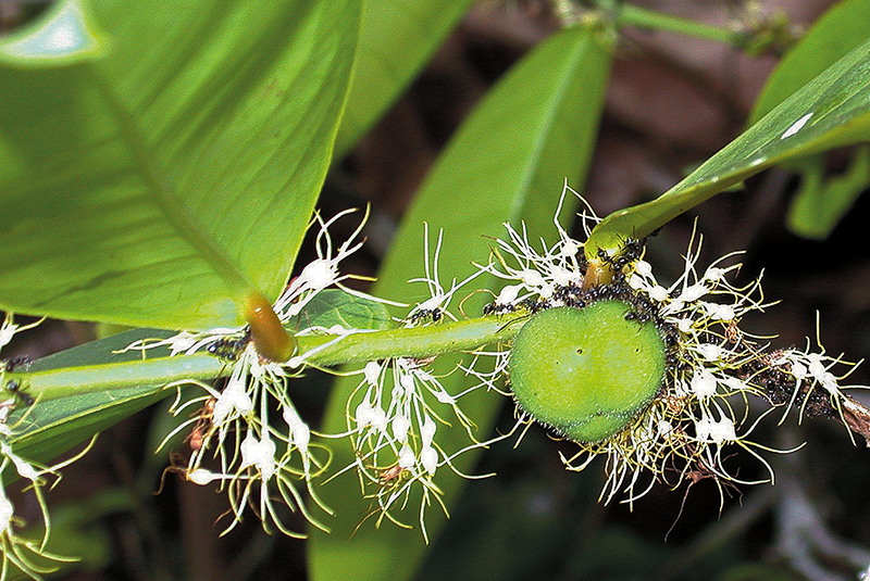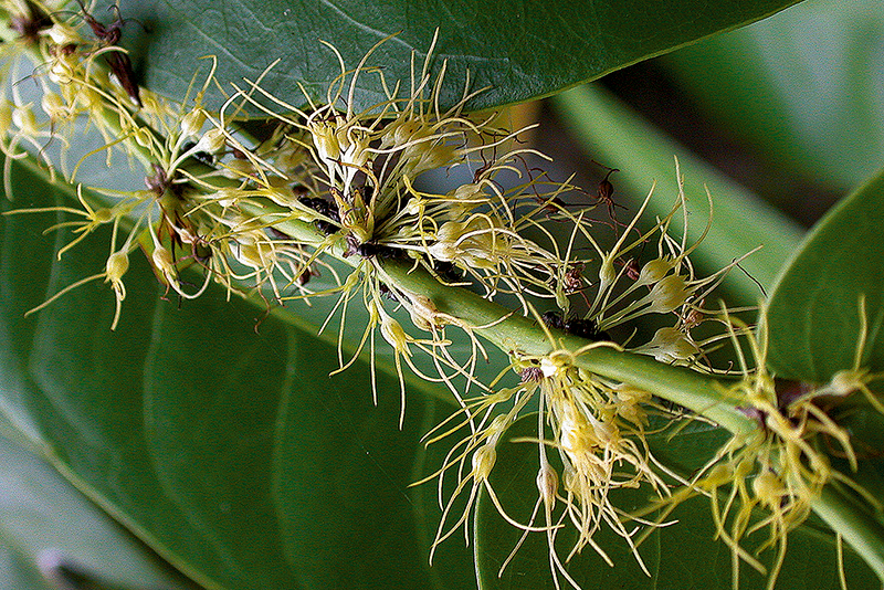 มะยมใบแข็ง: ดอกออกเป็นกระจุกตามซอกใบ ดอกเพศผู้จำนวนมาก กลีบเลี้ยงปลายเรียวแหลมรูปเส้นด้าย ผลจัก 3 พู ตื้น ๆ ด้านนอกมีขนสั้นนุ่ม (ภาพ: ราชันย์ ภู่มา)