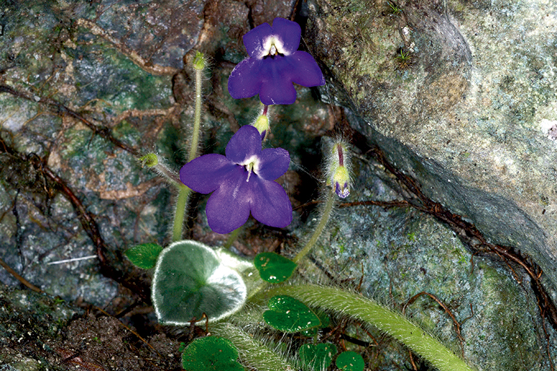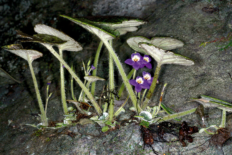 ไม้ล้มลุก มีขนสั้นนุ่มหนาแน่นตามเหง้า แผ่นใบ ก้านใบ ช่อดอก กลีบเลี้ยงและกลีบดอกด้านนอก ใบรูปกลมหรือรูปไข่กว้าง ยาว 4–9 ซม. ปลายกลม โคนใบแบบก้นปิด เส้นแขนงใบข้างละ 3–5 เส้น ก้านใบยาว 8–20 ซม. ใบอ่อนสีเงิน ช่อดอกคล้ายช่อซี่ร่มออกจากเหง้า 1–2 ดอก ก้านช่อยาว 4.5–7.5 ซม. ก้านดอกยาว 0.7–1.7 ซม. กลีบเลี้ยงรูปปากเปิด ยาวประมาณ 5 มม. กลีบรูปแถบ กลีบบน 2 กลีบ แยกกัน 3 กลีบล่างเชื่อมติดกันประมาณ 2 มม. ดอกสีม่วงเข้ม หลอดกลีบดอกยาวประมาณ 4.5 มม. ด้านในมีต่อมเล็ก ๆ กลีบปากบนยาว 6–8.5 มม. แฉกลึก กลีบล่างยาว 10–12.5 มม. กลีบรูปรีกว้าง กลีบกลางยาวประมาณ 8 มม. กลีบคู่ข้างยาวกว่าเล็กน้อย อับเรณูยาวประมาณ 4 มม. มีต่อมกระจาย เกสรเพศผู้ที่เป็นหมัน 3 อัน รังไข่มีขนและต่อมหนาแน่น ก้านเกสรเพศเมียยาว 8.5 มม. (ดูข้อมูลเพิ่มเติมที่ ขาวกำมะหยี่, สกุล)