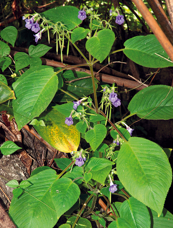 ไม้ล้มลุก สูง 50–60 ซม. มีขนต่อมเหนียวและขนปลายม้วนคล้ายตะขอตามลำต้น แผ่นใบทั้งสองด้าน ช่อดอก กลีบเลี้ยงและกลีบดอกด้านนอก และผล ใบรูปไข่ ยาว 5.5–17 ซม. ปลายแหลมยาว โคนเว้ารูปหัวใจ เบี้ยว ขอบจักซี่ฟัน เส้นแขนงใบข้างละ 8–15 เส้น ก้านใบยาว 2.5–11 ซม. ช่อดอกยาว 6–16 ซม. ก้านช่อยาว 3–7 ซม. ก้านดอกยาว 0.8–1.2 ซม. กลีบเลี้ยงรูปขอบขนาน ยาว 0.6–1.2 ซม. ดอกยาว 3.3–3.8 ซม. หลอดกลีบดอกยาว 2.5–3.4 ซม. กลีบรูปกลม คู่บนกว้างและยาว 6–7 มม. กลีบล่างใหญ่กว่ากลีบบนเล็กน้อย มีต่อมตามขอบกลีบและแอ่งบนแผ่นกลีบด้านในประปราย ก้านชูอับเรณูยาวประมาณ 9 มม. เกสรเพศผู้ที่เป็นหมันยาวประมาณ 5 มม. มีเกสรเพศผู้ลดรูป รังไข่ยาว 7.5–11 มม. ก้านยาว 7–9.5 มม. ผลยาว 4.5–5.5 ซม.พืชถิ่นเดียวของไทย พบทางภาคตะวันตกเฉียงใต้ที่กาญจนบุรี ขึ้นตามเขาหินปูนเตี้ย ๆ ความสูงไม่เกิน 100 เมตร