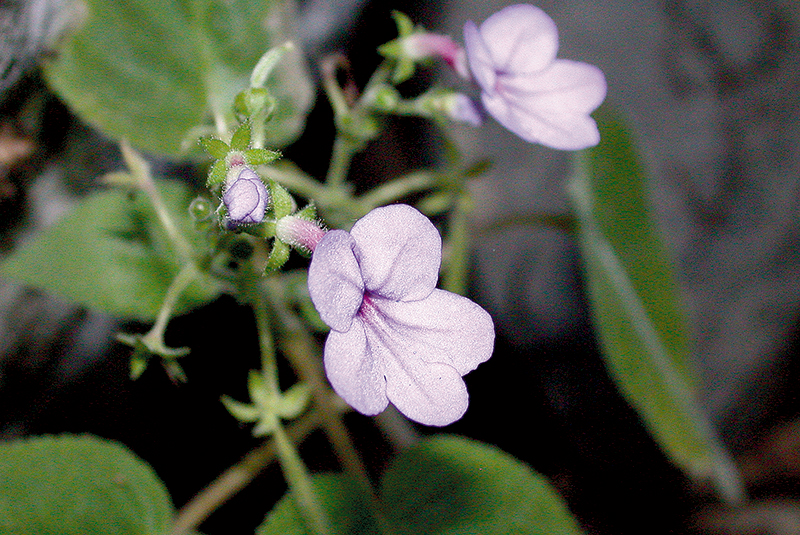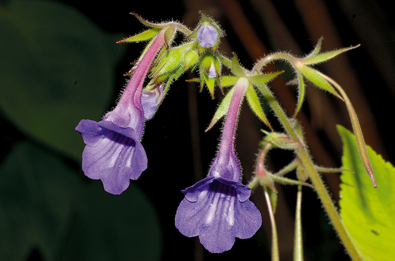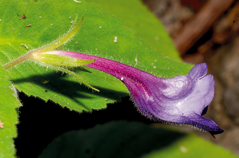 ม่วงไตรบุญดอกใหญ่: มีขนต่อมเหนียวและขนปลายม้วนคล้ายตะขอตามลำต้น แผ่นใบทั้งสองด้าน ช่อดอก กลีบเลี้ยง และกลีบดอกด้านนอก กลีบเลี้ยงและหลอดกลีบดอกยาว (ภาพ: ราชันย์ ภู่มา)