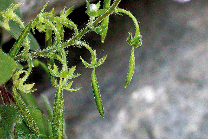 ม่วงไตรบุญ: มีขนปลายม้วนงอคล้ายตะขอและขนต่อมตามลำต้น แผ่นใบทั้งสองด้าน ช่อดอก กลีบเลี้ยงและกลีบดอกด้านนอก และผล กลีบเลี้ยง หลอดกลีบดอก และผลสั้น (ภาพ: ราชันย์ ภู่มา)