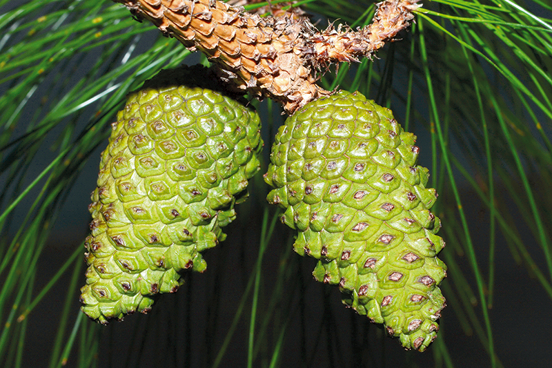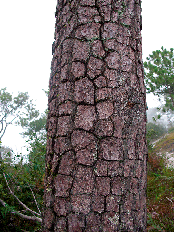 | | สนสามใบ: เปลือกแตกเป็นร่องสีน้ำตาลปนเทา ลอกเป็นแผ่นบาง มี 3 ใบในแต่ละกระจุก โคนรูปไข่ (ภาพ: สุคนธ์ทิพย์ ศิริมงคล, ภัทธรวีร์ พรหมนัส)
