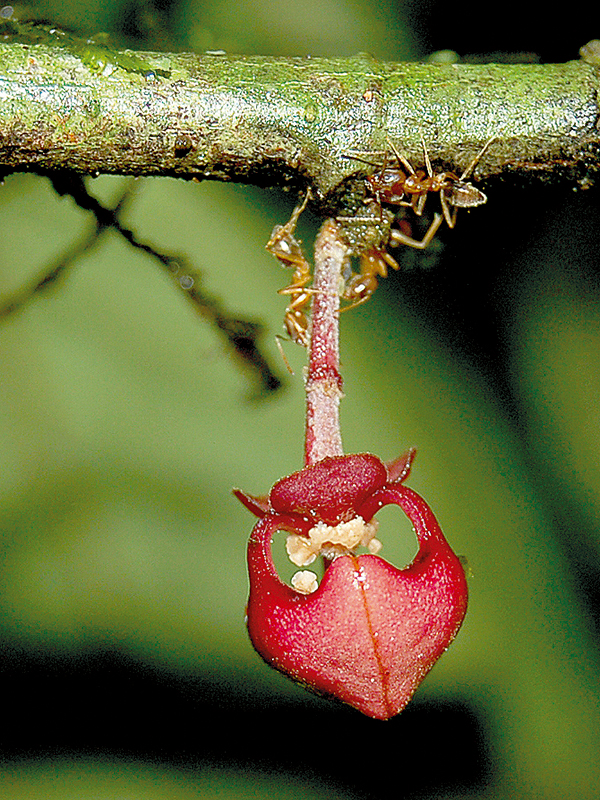 สังหยูดอกแดง: กลีบดอก 6 กลีบ เรียง 2 วง กลีบนอก 3 กลีบสั้นกว่า 3 กลีบใน กลีบวงใน 3 กลีบ มีก้านกลีบ เรียงประกบกัน ผลมีขนสีน้ำตาลหนาแน่น (ภาพ: มนตรี ธนรส)