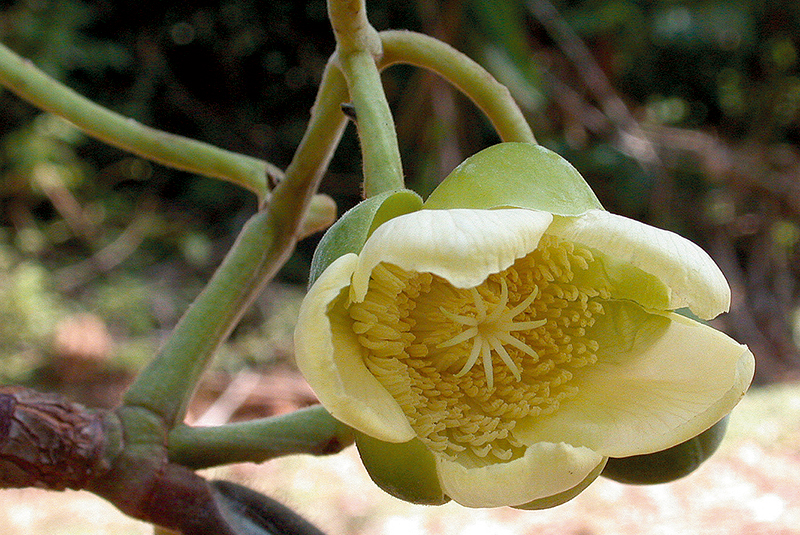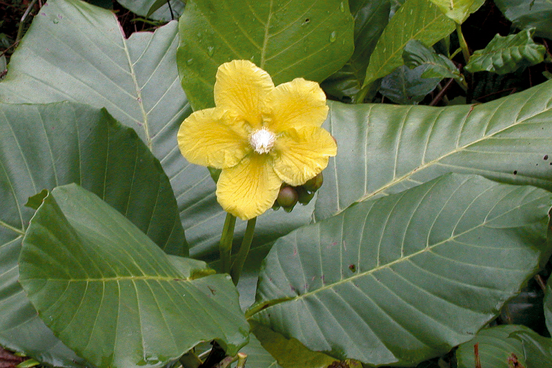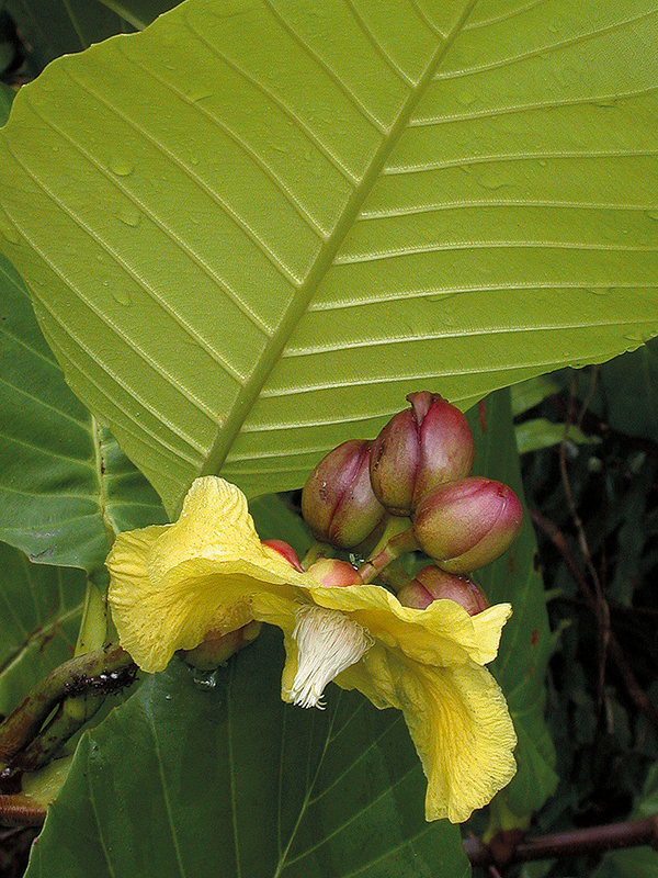 ไม้พุ่ม อาจสูงได้ถึง 10 ม. ใบรูปรีหรือรูปไข่ ยาว 15–30 ซม. ปลายมนหรือกลม โคนมน ขอบจักตามเส้นแขนงใบ เส้นแขนงใบข้างละ 12–20 เส้น ก้านใบยาว 2–6 ซม. มีปีกกว้าง หุ้มใบอ่อน ช่อดอกแบบช่อกระจะออกที่ปลายกิ่ง มี 4–18 ดอก ก้านดอกยาว 1–3 ซม. กลีบเลี้ยงรูปไข่กลับ ยาว 1.5–2.2 ซม. ดอกสีเหลือง กลีบบาง รูปรีหรือรูปไข่ ยาว 4–5 ซม. เกสรเพศผู้สีขาว วงนอกโค้ง ยาว 6–8 มม. วงในสุดพับงอ ยาวประมาณ 1.3 ซม. มี 5–8 คาร์เพล ยาวประมาณ 5 มม. ก้านเกสรเพศเมียยาวประมาณ 1 ซม. ผลแห้งแตกอ้าออก สีแดง ยาว 2–2.5 ซม. กลีบเลี้ยงพับงอ แต่ละคาร์เพลมี 1–4 เมล็ด เมล็ดมีเยื่อหุ้มสีแดงมีถิ่นกำเนิดในคาบสมุทรมลายู บอร์เนียว ชวา และสุมาตรา เป็นไม้ประดับทั่วไปในเขตร้อน
