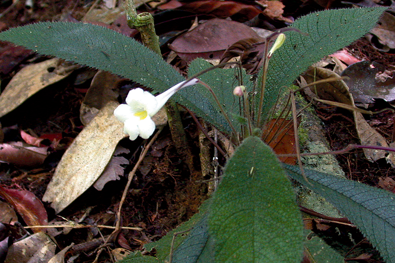 ไม้ล้มลุกมีเนื้อไม้ สูงได้ถึง 60 ซม. มีขนยาวหนาแน่นตามกิ่งอ่อน เส้นแขนงใบด้านล่าง ช่อดอก และกลีบเลี้ยง ใบเรียงเวียนรอบโคนต้น รูปใบหอกกลับ ยาว 8–13 ซม. ปลายแหลม โคนเรียวสอบจรดก้านใบ ขอบจักฟันเลื่อยถี่ แผ่นใบด้านบนนูนเป็นตุ่ม มีขนสาก ด้านล่างมักมีสีม่วงอมแดง เส้นแขนงใบจำนวนมาก ก้านใบสั้นหรือเกือบไร้ก้าน ช่อดอกมี 1–5 ช่อ ออกตามซอกใบ ก้านช่อยาว 2.5–5 ซม. แต่ละช่อมีดอกเดียว ก้านดอกยาวประมาณ 1.2 ซม. กลีบเลี้ยงรูปใบหอก ยาว 2–4 มม. ดอกรูปแตร สีขาวหรืออมม่วง ยาว 3.5–4.5 ซม. มีขนประปราย กลีบบนขนาดเล็กกว่ากลีบล่าง ด้านล่างมีปื้นสีเหลือง 2 แนว รังไข่มีขน ผลรูปทรงกระบอก ยาว 4–10 ซม. โค้งเล็กน้อย มีขนสั้นนุ่ม (ดูข้อมูลเพิ่มเติมที่ แก้วน้ำค้าง, สกุล)