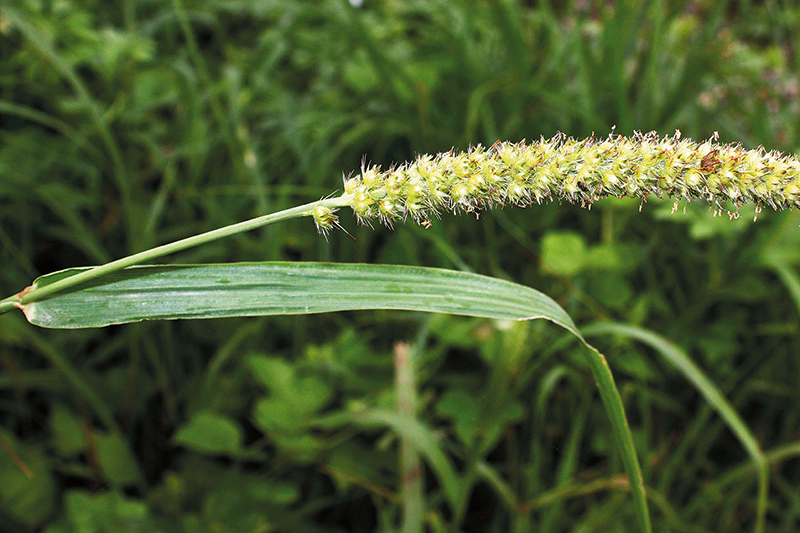 หญ้าขี้ครอก: ช่อดอกแยกแขนงรูปทรงกระบอกแคบ ๆ มีขนแข็งคล้ายหนาม กาบประดับเป็นขนแข็งเชื่อมติดกันที่โคนรูปถ้วย (ภาพ: สุคนธ์ทิพย์ ศิริมงคล)