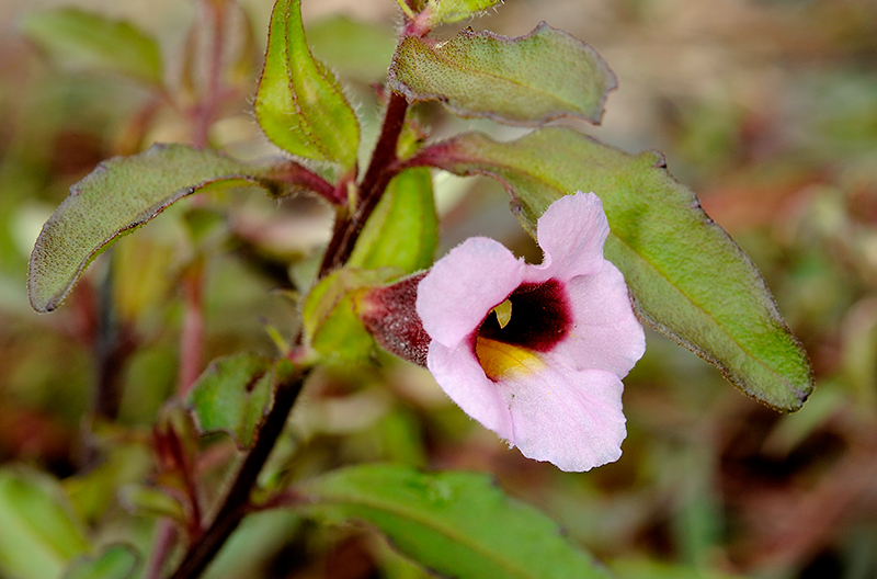 หญ้าดอกลำโพง: ส่วนต่าง ๆ มีขนหยาบแผ่ออก ใบช่วงบนเรียงเวียน โคนเรียวสอบจรดก้านใบ กลีบเลี้ยงรูปใบพาย ดอกรูปลำโพง หลอดกลีบดอกสีม่วงอมแดงหรือเหลือง (ภาพ: ปรีชา การะเกตุ)