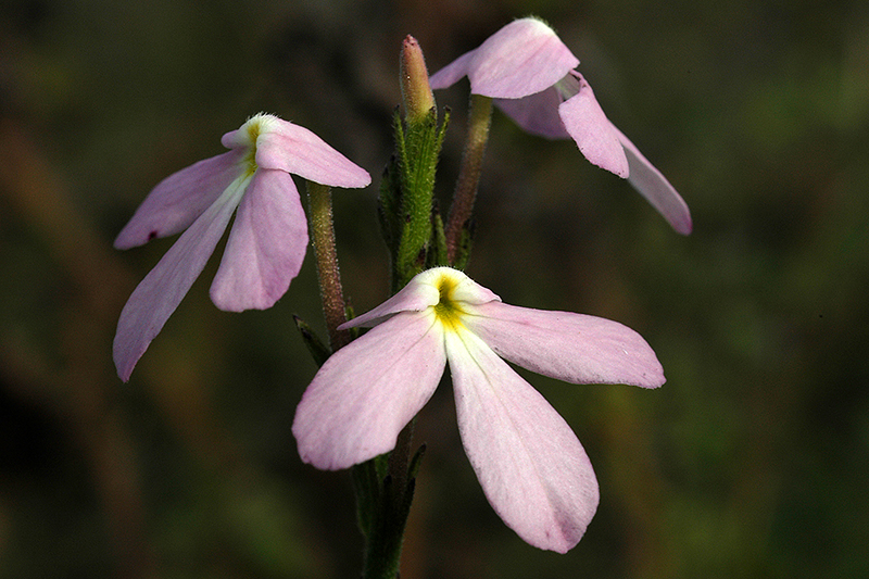 หญ้าแม่มดใหญ่: ใบรูปแถบ ดอกออกเดี่ยว ๆ ดูคล้ายช่อเชิงลด กลีบเลี้ยงแฉกลึกเกินกึ่งหนึ่ง ดอกสีชมพู (ภาพ: ราชันย์ ภู่มา)