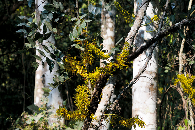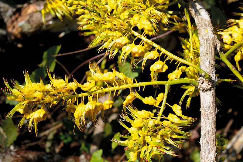 หนามขี้แรด: ลำต้นมีหนามแข็งและหนามโค้งทั่วไป ช่อแขนงแบบช่อกระจะ กลีบเลี้ยงสีเขียวอมเหลืองคล้ายกลีบดอก กลีบล่างรูปคุ่ม ดอกสีเหลือง กลีบขนาดไม่เท่ากัน (ภาพ: ปรีชา การะเกตุ)