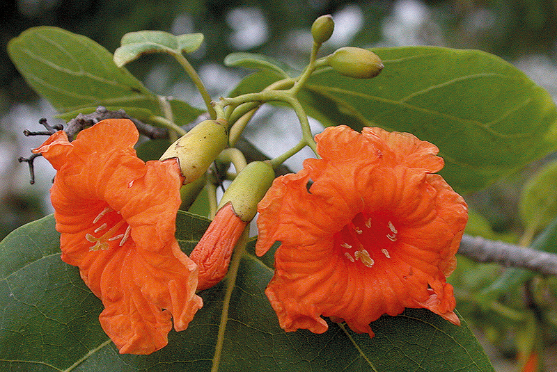 ไม้พุ่มถึงไม้ต้น สูงได้ถึง 15 ม. เนื้อไม้สีส้ม ใบรูปไข่หรือรูปรี ยาว 8–20 ซม. ปลายมน กลม หรือแหลมสั้น ๆ โคนใบมนถึงกลม เส้นแขนงใบข้างละ 4–6 เส้น ก้านใบยาว 2–8 ซม. ช่อดอกออกสั้น ๆ ตามปลายกิ่ง ก้านช่อยาวประมาณ 2 ซม. มีได้ถึง 20 ดอก ก้านดอกยาวได้ถึง 1 ซม. หลอดกลีบเลี้ยงยาว 1–2 ซม. ปลายแยกเป็นแฉกสั้น ๆ ไม่เท่ากัน ดอกรูปแตร สีส้ม ยาว 3–5 ซม. ย่น ปลายแยกเป็น 5–8 กลีบ รูปกลม ๆ เกสรเพศผู้เท่าจำนวนกลีบดอก ติดที่โคนกลีบดอกใกล้ปากหลอดกลีบ เกสรเพศเมียยาว 2–3 ซม. ผลมีกลีบเลี้ยงที่เจริญหุ้มจนมิด รูปไข่กลับ ยาว 2–3 ซม. ผนังผลแข็งเป็นคอร์ก มี 1–4 เมล็ด (ดูข้อมูลเพิ่มเติมที่ คอร์เดีย, สกุล)
