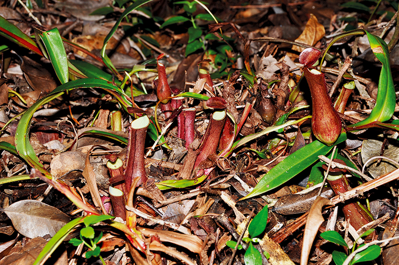 หม้อแกงลิงเล็ก: โคนสอบเรียวโอบลำต้น หม้อล่างรูปคนโท ฝาหม้อรูปไข่กว้าง (ภาพ: มานพ ผู้พัฒน์)