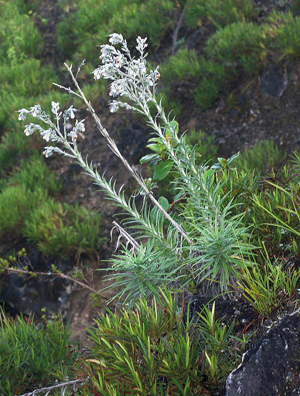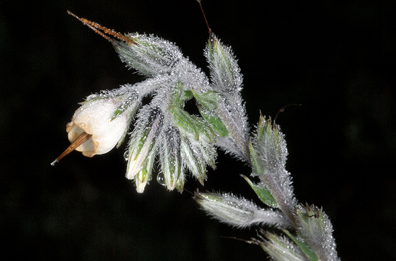 ไม้ล้มลุก อาจสูงได้มากกว่า 1 ม. มีขนยาวหนาแน่นตามกิ่งอ่อน ช่อดอก และกลีบเลี้ยง ใบที่โคนต้นจำนวนมาก แห้งติดทน ใบรูปใบหอก ยาว 6–11 ซม. แผ่นใบด้านบนมีขนสาก ด้านล่างมีขนแบบใยไหม ใบบนลำต้น ยาว 3–7 ซม. ช่อดอกแบบช่อกระจุกแยกแขนง ออกหนาแน่นช่วงปลายกิ่ง ยาว 10–30 ซม. ช่อกระจุกย่อยแบบช่อปลายม้วน ยาว 3–5 ซม. กลีบเลี้ยงและกลีบดอกจำนวนอย่างละ 5 กลีบ กลีบเลี้ยงแยกจรดโคน รูปแถบ ยาว 0.8–1 ซม. ดอกรูปกรวยคว่ำ สีขาวเปลี่ยนเป็นสีน้ำตาลอ่อน กว้าง 5–7 มม. ยาว 1–1.3 ซม. ด้านในมีขนอุยเรียงเป็นรูปแถบสั้น ๆ ใกล้โคนกลีบ ต่อมน้ำต้อยจักเป็นพูขนาดเล็ก มีขนอุย เกสรเพศผู้ 5 อัน ยื่นเลยหลอดกลีบ มีขน อับเรณูเรียงติดกันเป็นหลอด ก้านเกสรเพศเมียเกลี้ยง ยอดเกสรเป็นตุ่ม ผลย่อยแเบบเปลือกแข็งเมล็ดล่อนมี 4 ผล รูปสามเหลี่ยมแกมรูปไข่ ยาวประมาณ 3–3.5 ซม. สีน้ำตาล มีตุ่มกระจาย