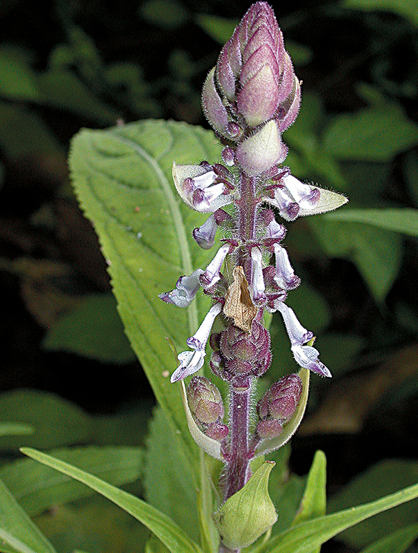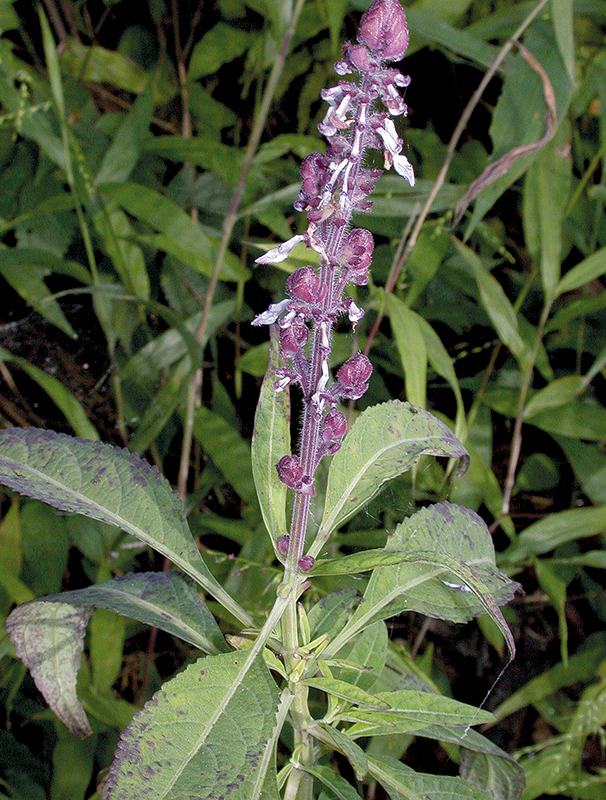 ไม้ล้มลุก สูงได้ถึง 1 ม. ใบรูปใบหอกหรือรูปใบหอกกลับ ยาว 3–10 ซม. โคนรูปลิ่มหรือสอบ แผ่นใบมีขนประปราย มีต่อมด้านล่าง ก้านใบยาว 0.5–1.5 ซม. ช่อดอกยาวได้ถึง 20 ซม. แยกแขนง แกนช่อมีขนและต่อม ช่อกระจุกเรียงรอบข้อ ห่างกัน 0.5–1 ซม. ไร้ก้าน แต่ละช่อมี 2–3 ดอก ใบประดับรูปไข่ ยาว 4–6 มม. ร่วงเร็ว มีขน ก้านดอกยาว 0.5–1 มม. ขยายในผลยาว 2–3 มม. ดอกมีขนและต่อมกระจาย หลอดกลีบเลี้ยงยาว 2–3 มม. กลีบบนและกลีบล่างคู่ข้างขอบจัก กลีบบนกลม กลีบล่างรูปใบหอก สั้นกว่ากลีบบน ขยายในผลยาว 7–8 มม. ดอกสีม่วง ยาวประมาณ 1 ซม. หลอดกลีบยาว 6–7 มม. กลีบบนขนาดเล็ก กลีบล่างรูปไข่กลับ ยาว 3–4 มม. เกสรเพศผู้ยาวเท่า ๆ กลีบดอก ผลรูปรี สีดำ ยาวประมาณ 1 มม. พบในพม่า และภาคเหนือตอนล่างของไทยที่ตาก ขึ้นริมลำธารที่เป็นหินปูน ความสูง 200–600 เมตร