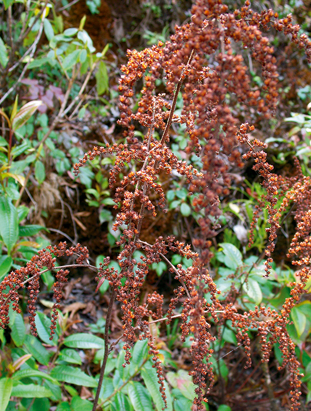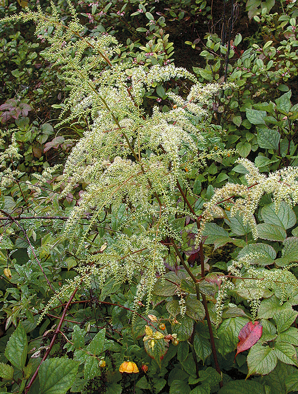 ไม้ล้มลุก สูงได้ถึง 2.5 ม. มีเหง้า มีขนยาวและขนต่อมสีน้ำตาลหนาแน่นตามลำต้น เส้นแขนงใบด้านล่าง แกนใบ และช่อดอก หูใบบาง ติดที่โคนก้านใบ ยาวได้ถึง 2 ซม. ปลายแยก 2 แฉก รูปสามเหลี่ยม ยาว 4–6 มม. ใบประกอบมี 3 ใบย่อย 2–3 ชั้น เรียงเวียน ก้านใบประกอบยาว 15–40 ซม. ใบย่อยรูปไข่ รูปไข่กลับ หรือรูปสี่เหลี่ยมข้าวหลามตัด ยาว 4–14.5 ซม. ปลายแหลมยาว โคนกลมหรือเว้าตื้น ขอบจัก แผ่นใบด้านบนมีขนแข็งประปราย ก้านใบย่อยไร้ก้านหรือยาวได้ถึง 2 ซม. ช่อดอกแบบช่อแยกแขนง ออกที่ยอด ยาวได้ถึง 40 ซม. ใบประดับ 3 อัน ยาวประมาณ 2 มม. ขอบจัก ดอกสีขาวหรือสีแดง ก้านดอกยาว 1–2 มม. ใบประดับย่อยขนาดเล็ก กลีบเลี้ยง 4–5 กลีบ รูปไข่ ยาว 1–2 มม. ส่วนใหญ่ไม่มีกลีบดอก หรือมี 1–2 กลีบ ขนาดเล็ก เกสรเพศผู้ 5–12 อัน ก้านชูอับเรณูยาว 2–3 มม. อับเรณูกลม มี 2 คาร์เพล เชื่อมติดกันที่โคน พลาเซนตารอบแกนร่วม ก้านเกสรเพศเมียสั้น กางออก ผลแห้งแตก กางออก ยาว 4–5 มม. เมล็ดขนาดเล็ก จำนวนมากพบที่อินเดีย ภูฏาน เนปาล จีนตอนใต้ พม่า ลาว และเวียดนาม ในไทยพบทางภาคเหนือที่ดอยอินทนนท์ จังหวัดเชียงใหม่ ขึ้นตามที่โล่งชายป่าดิบเขาสูง ความสูง 2400–2500 เมตร รากมีสรรพคุณแก้ท้องเสีย บิด และโรคไขข้อ ใบสดเคี้ยวแก้ปวดฟันสกุล Astilbe มีประมาณ 18 ชนิด พบในอเมริกาเหนือและเอเชีย ในไทยมีชนิดเดียว ชื่อสกุลมาจากภาษากรีก “a” ไม่มี และ “stilbe” เป็นมันวาว ตามลักษณะดอกและใบ