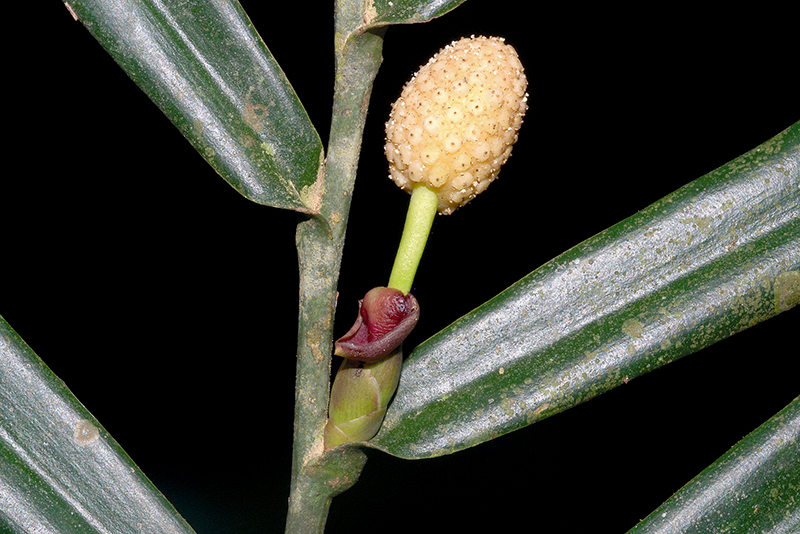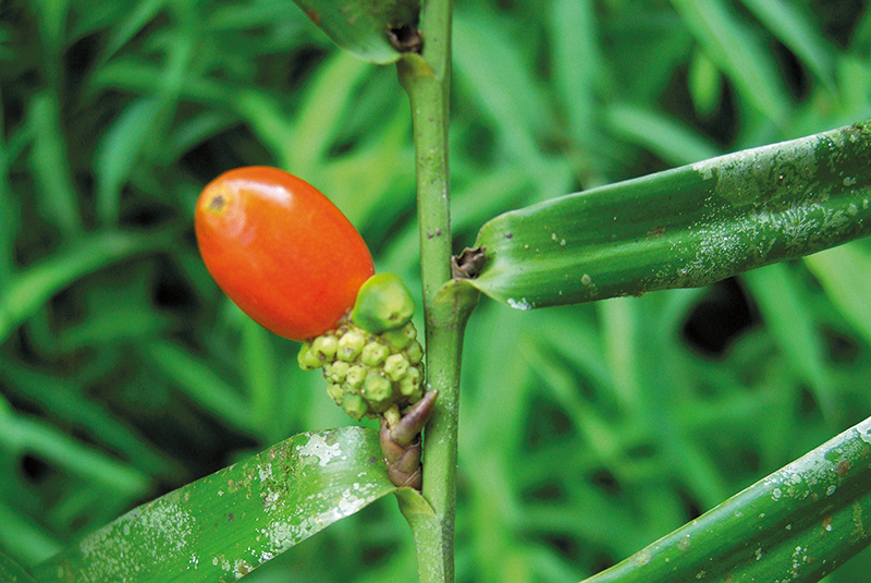 เถาพันดง: ช่อดอกจำนวนมาก ออกเดี่ยว ๆ ตามซอกใบ กาบสีม่วงอมน้ำตาล รูปไข่ เว้า พับงอกลับ โคนตัด ปลายมีติ่ง ผลสุกสีส้มอมแดง (ภาพ: ราชันย์ ภู่มา, ปรีชา การะเกตุ, นันทน์ภัส ภัทรหิรัญไตรสิน)