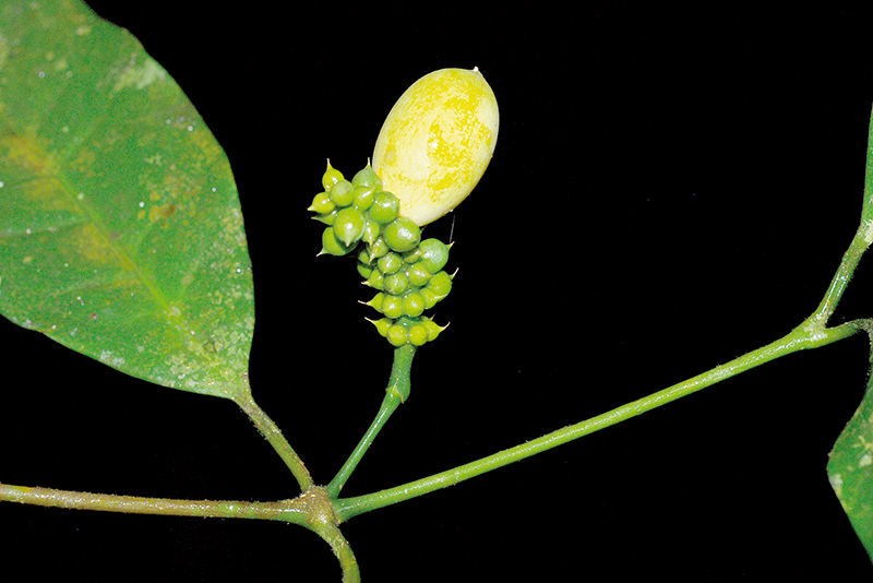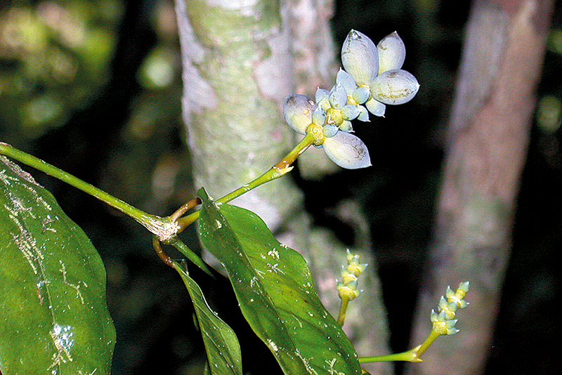 เมื่อยดำ: ช่อดอกออกเดี่ยว ๆ เป็นกระจุกตามลำต้น ห้อยลง เมล็ดไร้ก้าน มี 5–7 เมล็ดในแต่ละวง เป็นมันวาว (ภาพ: สุคนธ์ทิพย์ ศิริมงคล)