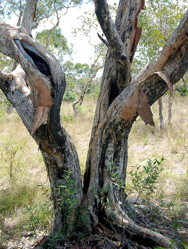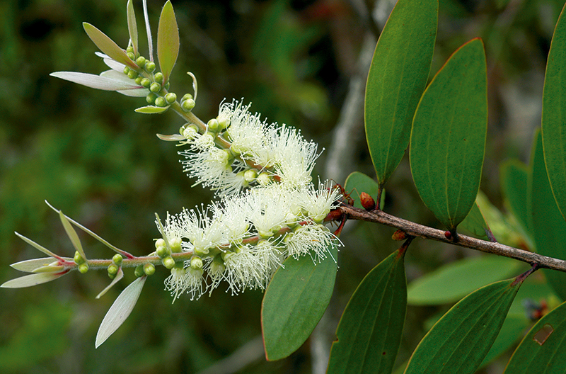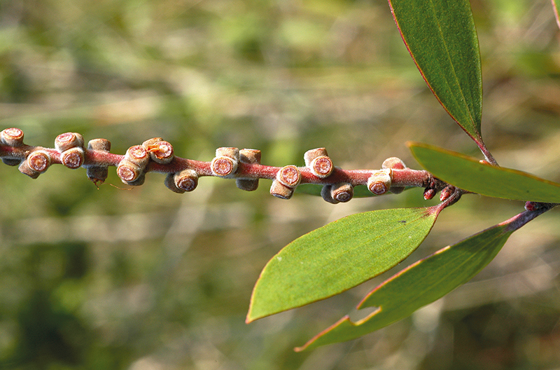 เสม็ด: เปลือกลอกเป็นชั้น ๆ ใบคล้ายรูปเคียว เส้นโคนใบข้างละ 1–3 เส้น ช่อดอกแบบช่อเชิงลด ปลายช่อมักแทงยอดใหม่ ดอกออกเป็นกระจุก 1–3 ดอก ไร้ก้าน ผลรูปกลม ๆ (ภาพ: มานพ ผู้พัฒน์, ราชันย์ ภู่มา)