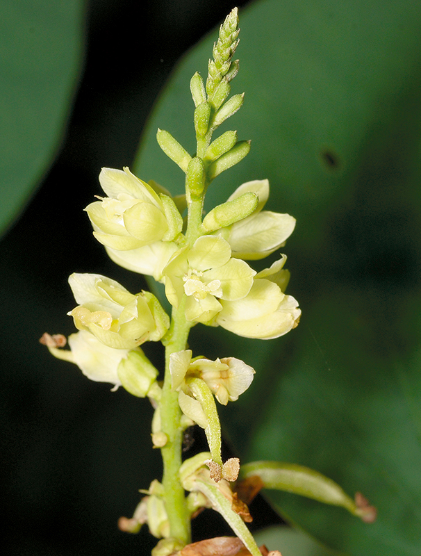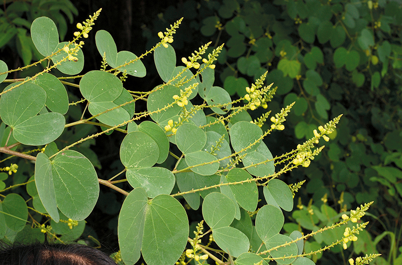 เสี้ยวฟ่อม: ช่อดอกแบบช่อกระจะเรียวยาว เกสรเพศผู้เป็นหมันในดอกเพศเมีย ยอดเกสรรูปโล่ ฝักรูปแถบ (ภาพ: ราชันย์ ภู่มา)