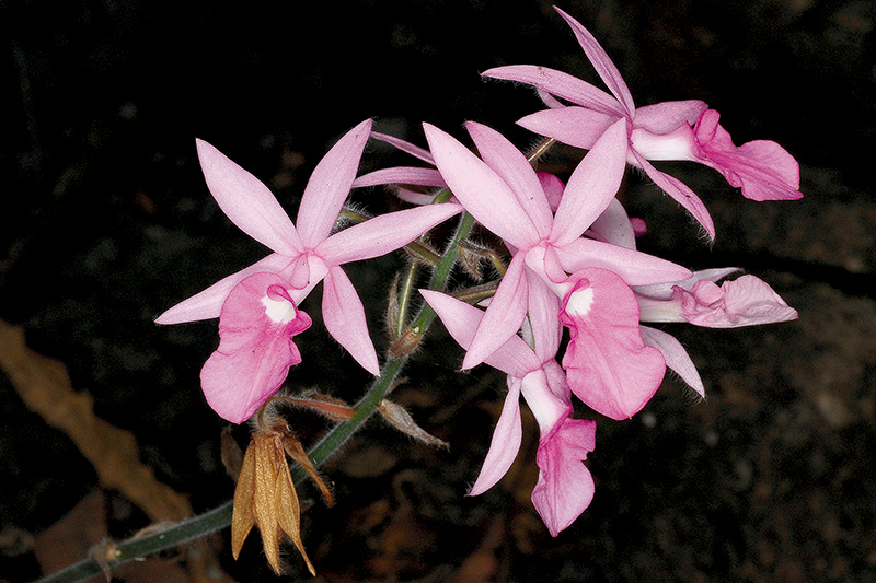 กล้วยไม้ดิน แตกกอ สูง 20–65 ซม. มีขนสั้นนุ่มตามช่อดอก ดอก และก้านดอกรวมรังไข่ ลำลูกกล้วยรูปไข่ แกมรูปขอบขนานหรือรูปใบหอก ยาว 3–14 ซม. มีรากหนาแน่น มี 1–4 ใบ รูปขอบขนาน ยาว 20–40 ซม. ก้านใบยาว 3.5–6 ซม. ใบแห้งช่วงออกดอก ก้านช่อดอกยาว 15–45 ซม. แกนช่อยาว 10–20 ซม. ใบประดับรูปไข่แกมรูปใบหอก ยาว 1–3.5 ซม. ติดทน ดอกสีชมพู กลีบปากมีสีเข้ม กลีบเลี้ยงรูปใบหอก ยาว 2–3 ซม. ปลายแหลม กลีบดอกคล้ายกลีบเลี้ยง กลีบปากโคนติดกลีบดอกคู่ข้าง ห่อคล้ายเป็นหลอด หุ้มเส้าเกสร ปลายบานออกรูปรีกว้างคล้ายสี่เหลี่ยม ยาว 2–2.5 ซม. ปลายเว้าตื้น ๆ คนมีเดือยเรียว ยาว 1–1.6 ซม. เส้าเกสรยาว 4–6 มม. มีขนสั้นนุ่ม รังไข่รวมก้านดอกยาว 2–3 ซม. (ดูข้อมูลเพิ่มเติมที่ เอื้องน้ำต้น, สกุล)