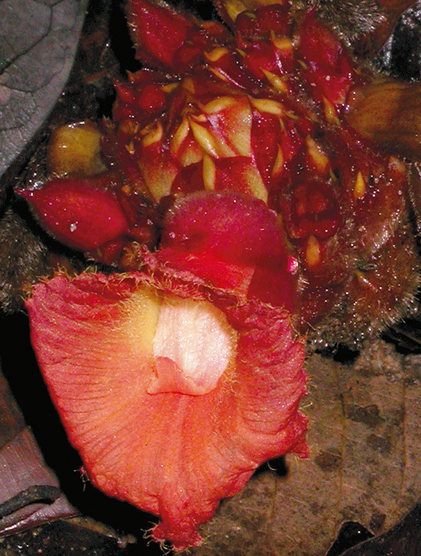 ไม้ล้มลุก สูงได้ถึง 3 ม. ใบรูปขอบขนาน ยาวได้ถึง 30 ซม. ปลายและโคนแหลม กาบใบสั้นเป็นหลอดติดลำต้น ช่อดอกออกจากเหง้าที่ไม่มีใบ ก้านช่อสั้น หรือยาวได้ถึง 20 ซม. มีขนสั้นนุ่ม ใบประดับสีแดง เรียงซ้อนเหลื่อมเป็นกระจุกกลม เส้นผ่านศูนย์กลาง 5–9 ซม. ใบประดับรูปรี ยาว 2–3.5 ซม. ปลายกลมมีติ่งแหลมคล้ายหนาม ยาว 2–3 มม. ด้านนอกมีขนแข็ง ใบประดับย่อยยาวเท่า ๆ ใบประดับ โอบรอบรังไข่ หลอดกลีบเลี้ยงสีแดง ยาว 3–4 ซม. มีขนสั้นนุ่ม กลีบยาว 6–8 มม. ปลายมีติ่งหนาม หลอดกลีบดอกสั้น กลีบรูปรี ยาวประมาณ 3.5 ซม. สีชมพูหรือแดง ปลายแผ่นก้านชูอับเรณูพับงอกลับ กลีบปากสีส้ม แดง หรือเหลือง ขอบด้านในมีขน รังไข่มีขนสั้นนุ่ม ผลมีใบประดับหุ้ม (ดูข้อมูลเพิ่มเติมที่ เอื้องหมายนา, สกุล)