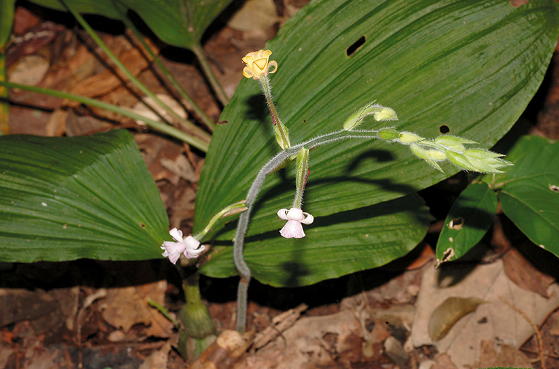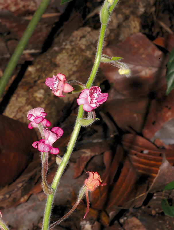 กล้วยไม้ดิน ลำลูกกล้วยรูปไข่ คอดคล้ายน้ำเต้า ยาว 2.5–8.5 ซม. ใบรูปขอบขนาน หรือรูปใบหอก ยาว 15–47 ซม. ก้านใบ ยาว 3–9 ซม. ก้านช่อดอกยาว 10–53 ซม. มีขนหนาแน่น แกนช่อยาว 5–22 ซม. ใบประดับรูปขอบขนานหรือรูปใบหอก ยาว 1–5 ซม. ใบประดับย่อยขนาดเล็กกว่า ติดทน ดอกสีชมพู อมเหลือง หรือขาว เปลี่ยนเป็นสีน้ำตาลอมส้มเข้มก่อนร่วง กลีบเลี้ยงรูปขอบขนานแกมรูปไข่ ยาว 0.8–1.4 ซม. ปลายแหลม กลีบดอกคู่ข้างยาวเท่า ๆ กลีบเลี้ยง แคบกว่าเล็กน้อย กลีบปากโคนเชื่อมติดโคนเส้าเกสร ปลายบานออก ยาวเท่า ๆ กลีบเลี้ยง ปลายจัก 3 พู พูข้างกว้าง ห่อเข้า พูกลางรูปขอบขนานคล้ายรูปพัด ปลายตัดหรือเว้าตื้น ๆ ด้านในมีจุดสีเข้มหนาแน่น โคนมีแนวยาว 3 สัน เดือยเรียว ยาว 1–2.8 ซม. เส้าเกสรยาว 3–5 มม. คางยาว 3–4 มม. จะงอยจัก 2 พู ก้านดอกรวมรังไข่ยาว 2–5 ซม. ผลรูปรี ยาวประมาณ 2 ซม.