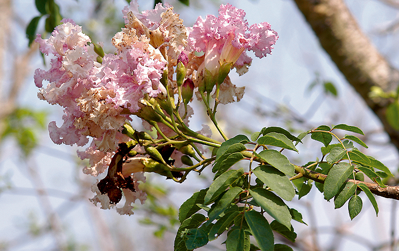 ไม้ต้น ใบประกอบชั้นเดียว เรียงเวียนหนาแน่นที่ปลายกิ่ง แผ่นใบด้านล่างมีต่อมประปราย ช่อดอกแบบช่อกระจุกแยกแขนง กลีบเลี้ยงเชื่อมติดกันเป็นหลอด กลีบแฉกไม่เท่ากัน ด้านนอกมีตุ่ม ดอกรูปลำโพงหรือรูประฆัง มี 5 กลีบ ขนาดเท่า ๆ กัน แผ่นกลีบย่น เกสรเพศผู้อันสั้น 2 อัน อันยาว 2 อัน ไม่ยื่นพ้นปากหลอดกลีบดอก จุดติดมีขน ผลแห้งแตกตามยาว รูปขอบขนานสั้น ๆ ผนังกั้นรูปกากบาท ผนังเทียมหนาเป็นคอร์ก เมล็ดบางคล้ายจาน มีปีกบางรูปครึ่งวงกลม