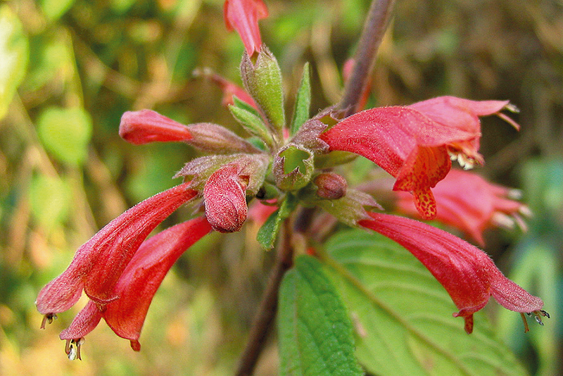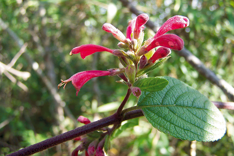 ไม้พุ่ม สูง 1–3 ม. มีขนสั้นนุ่มสีน้ำตาลแดงตามกิ่ง แผ่นใบ ช่อดอก กลีบเลี้ยงและกลีบดอกด้านนอก ใบรูปรีหรือรูปขอบขนาน ยาว 4.5–8.5 ซม. ปลายแหลมยาว โคนแหลม มน หรือกลม ขอบจักมนเป็นติ่ง ใบประดับคล้ายใบ รูปไข่ ยาว 2–3 ซม. ใบประดับย่อยยาว 2–3 มม. ก้านดอกยาว 1–2 มม. กลีบเลี้ยงรูประฆัง ยาว 0.6–1 ซม. กลีบรูปสามเหลี่ยม ยาว 2–3 มม. ดอกสีแดงหรืออมสีเหลือง ยาว 2.5–2.8 ซม. หลอดกลีบดอกยาวประมาณ 2.3 ซม. ปากบนรูปขอบขนาน ปลายมนหรือเว้าตื้น ๆ รังไข่มีตุ่มกระจาย
