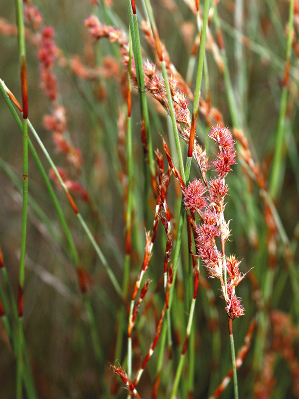 ไม้ล้มลุก แตกกอหนาแน่น สูงได้ถึง 1 ม. แยกเพศต่างต้นหรือมีดอกสมบูรณ์เพศร่วมต้น เหง้าทอดเลื้อย มีเกล็ดเรียงซ้อนเหลื่อม ต้นอ่อนมีขนคล้ายขนแกะหนาแน่น ลำต้นกลวง เหนียว มีกาบยาว 1–3 ซม. ปลายเรียวแหลม ขอบมีขนคล้ายไหม ใบขนาดเล็กแนบติดลำต้น ช่อดอกแบบช่อแยกแขนง ช่อย่อยแบบช่อเชิงลดเป็นกระจุกแน่น ใบประดับรูปไข่แคบ สีน้ำตาลแดง ยาว 2–2.5 มม. ช่อดอกเพศผู้มีดอกเดียว กลีบรวมมี 4–6 กลีบ คู่นอกเรียงตรงข้าม รูปเรือ ยาวประมาณ 2 มม. กลีบในแคบและสั้นกว่าเล็กน้อย เกสรเพศผู้ 3 อัน ก้านชูอับเรณูยาวประมาณ 1.5 มม. ปลายอับเรณูเป็นติ่งแหลม ช่อดอกเพศเมียมี 3–5 ดอก กลีบรวมมี 6–8 กลีบ สั้นกว่าในดอกเพศผู้เล็กน้อย รังไข่มีช่องเดียว ก้านเกสรเพศเมียสั้น ยอดเกสรแยก 3 แฉก ผลแห้งแตกด้านเดียว รูปรี ยาว 0.5–1 มม.