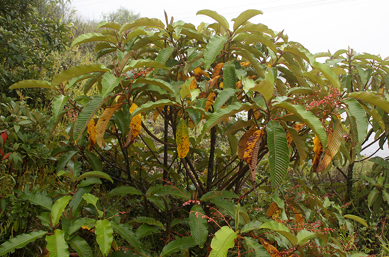 | ไม้พุ่มหรือไม้ต้น สูงได้ถึง 10 ม. มีขุย เกล็ด และขนสีน้ำตาลแดงตามกิ่งอ่อน ก้านใบ ช่อดอก และใบประดับ ใบรูปรี รูปขอบขนาน หรือแกมรูปไข่กลับ ยาว 15–35 ซม. แผ่นใบด้านล่างมีขนสั้นนุ่มสีน้ำตาล เส้นแขนงใบจำนวนมาก ก้านใบยาว 2–5 ซม. ช่อดอกแบบช่อกระจุกแยกแขนง ออกตามซอกใบ ช่อยาว 15–35 ซม. ใบประดับยาว 3–5 มม. ก้านดอกยาว 1–2.5 ซม. กลีบเลี้ยงรูปไข่กว้าง ยาว 3–5 มม. ดอกสีชมพู ยาว 6–8 มม. หลอดกลีบดอกยาว 3–4 มม. ปลายกลีบพับงอกลับ เกสรเพศผู้จำนวนมาก ก้านชูอับเรณูยาวประมาณ 3 มม. รังไข่เกลี้ยง ก้านเกสรเพศเมียมี 3–5 อัน ติดทน ผลกลม เส้นผ่านศูนย์กลางประมาณ 1.5 ซม.