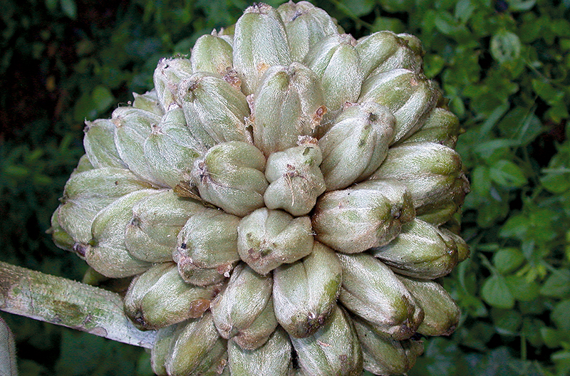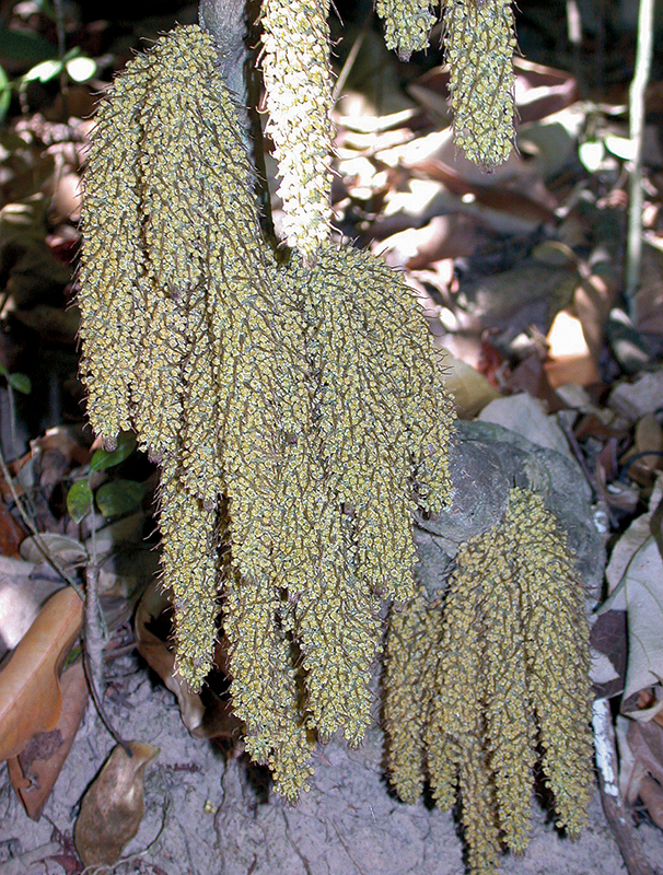 ไม้เถาเนื้อแข็ง แยกเพศต่างต้น เถามีตุ่มคล้ายหนามขนาดเล็กประปราย มีขนตามกิ่งอ่อน และแผ่นใบด้านล่าง ใบเรียงเวียนห่าง ๆ รูปไข่กว้าง หรือจัก 3 พู ยาว 10–20 ซม. ปลายแหลม โคนเว้าตื้น เส้นโคนใบข้างละ 1–3 เส้น ก้านใบยาว 3–7 ซม. ช่อดอกเพศผู้คล้ายช่อเชิงลดแยกแขนง ยาว 10–20 ซม. ออกตามซอกใบหรือลำต้น มีขนสั้นนุ่ม ช่อย่อยแบบช่อกระจุกแน่น มี 12–15 ดอก ใบประดับรูปเส้นด้าย ยาวได้ถึง 1 ซม. ติดทน ดอกขนาดเล็ก กลีบเลี้ยงมี 3–5 กลีบ กลีบดอก 3–4 กลีบ เกสรเพศผู้ส่วนมากมี 3–4 อัน เชื่อมติดกันสั้น ๆ รังไข่เป็นหมันมีขนยาว ช่อดอกเพศเมียแบบช่อกระจุกแน่น ก้านช่อหนา ออกตามซอกใบ 1–3 ช่อ ดอกคล้ายดอกเพศผู้ ก้านเกสรเพศเมียหนา ยอดเกสรจัก 2 พู ผลกลุ่ม ผลย่อยผนังชั้นในแข็ง เรียงหนาแน่นเป็นกระจุกกลม เส้นผ่านศูนย์กลางยาวได้ถึง 20 ซม. ผลย่อยรูปขอบขนานแกมรูปไข่ ยาว 4.5–8 ซม. มีขนหนาแน่น ผนังชั้นในแข็ง มีรูพรุน